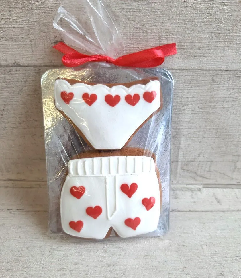 Оригинальное печенье от компании "Сладоленд" порадует любителей сладкого и станет прекрасным подарком любой праздник или значимую дату для влюбленных. В набор "Полный комплект" входят два печенья в виде мужских и женских трусов, украшенных сердечками. Любой будет рад такому вкусному сувениру, ведь интересный и запоминающийся дизайн, неповторимый вкус и аромат печенья делают его настоящим произведением искусства.