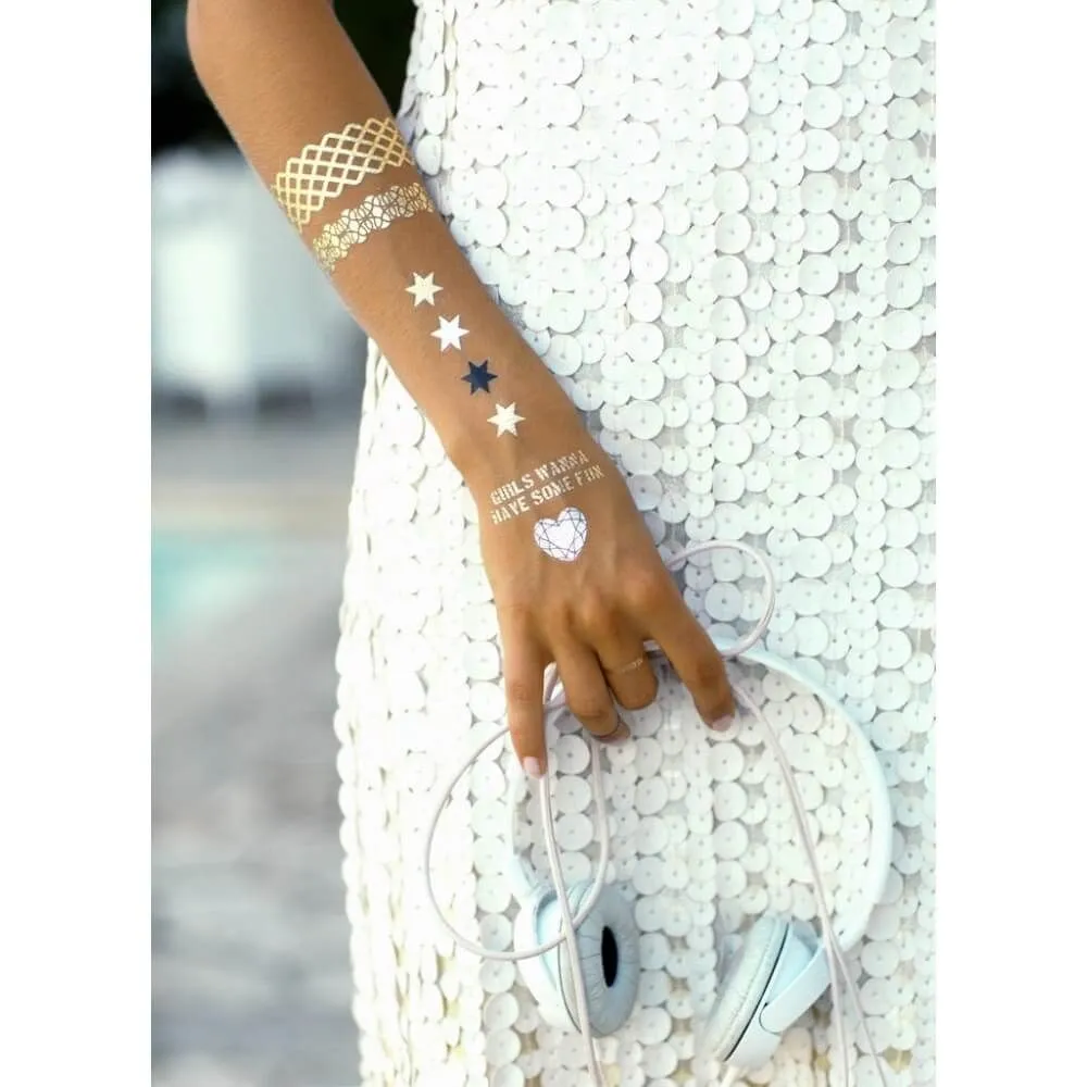 Коллекция временных тату для тела "Вечеринка у бассейна" из двух листов переводных узоров формата А5 с разным дизайном. Золотистое мерцание тату притягивает к себе внимание и Вы несомненно будете самой заметной персоной на любом мероприятии!