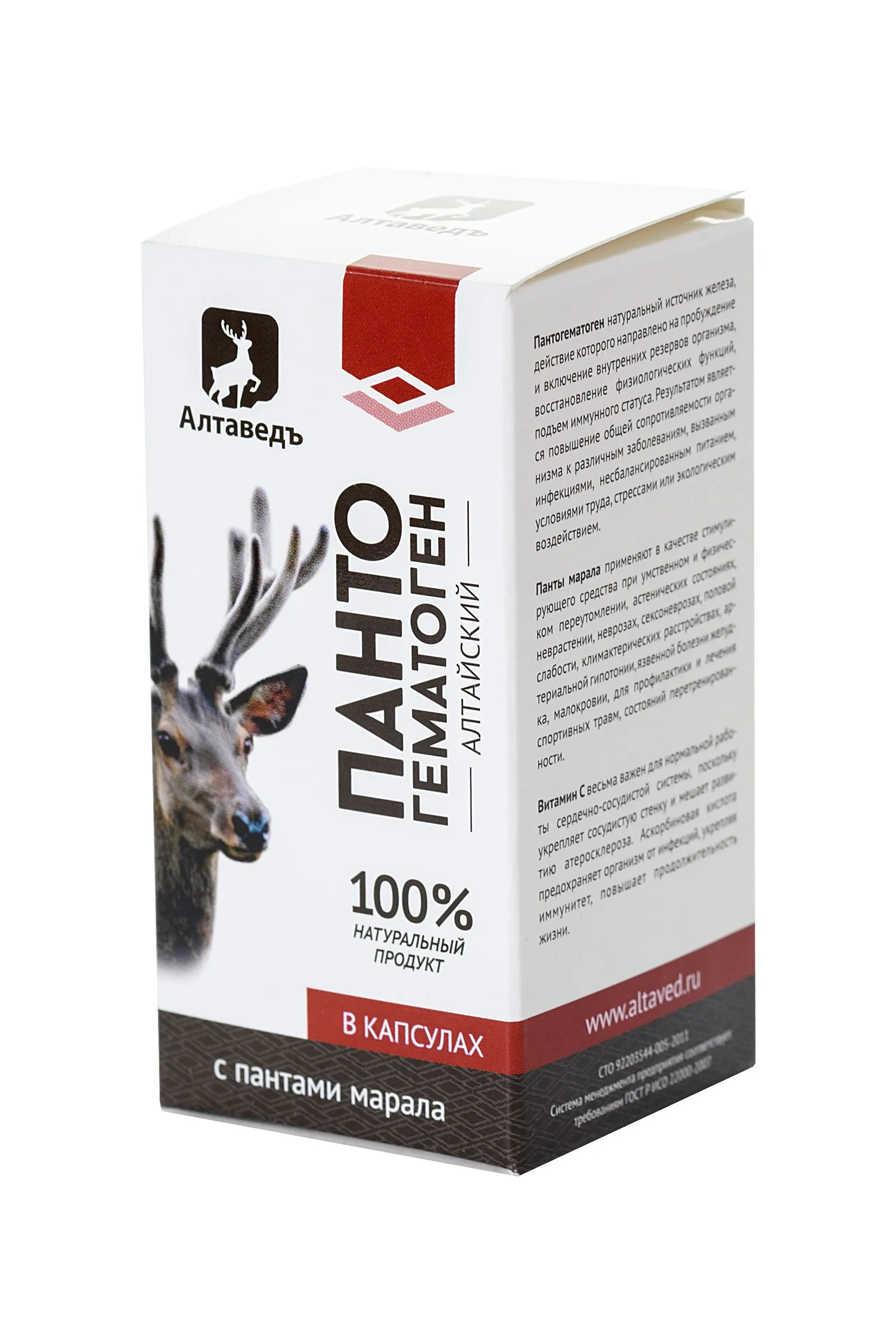 Капсулы “Пантогематоген” от АлтаВедъ — природный биостимулятор, пробуждающий внутренние резервы организма и восстанавливающий физиологические функции. увеличивает потенцию и усиливает эрекцию мужчин повышает либидо у женщин обладает общеукрепляющим и иммуномодулирующим эффектом стимулирует работу сердечно-сосудистой системы регулирует артериальное давление понижает холестерин устраняет зашлакованность организма питает мозг кислородом и делает память лучше улучшает работоспособность и выносливость уменьшает уровень стресса при перенапряжении (физическом и умственном) замедляет процесс старения половой системы и организма в целом эффективен при лечении опорно-двигательной и центральной нервной систем способствует регенерации тканей (в том числе костей) Полностью натуральный состав — пантогематоген сухой (кровь марала), панты марала сухие, витамин С. Панты марала помогают справиться с переутомлением, половой слабостью, неврозом. Пантогематоген – натуральный источник железа, пробуждает и поднимает иммунитет. Витамин С важен для нормальной работы сердечно-сосудистой системы. Рекомендации по применению: употреблять внутрь по 1 капсуле 3 раза в день во время еды, запивая жидкостью (вода, чай, сок). Противопоказания: Индивидуальная непереносимость компонентов. Форма выпуска: 30 капсул массой 0,5 г БАД, НЕ ЯВЛЯЕТСЯ ЛЕКАРСТВОМ.