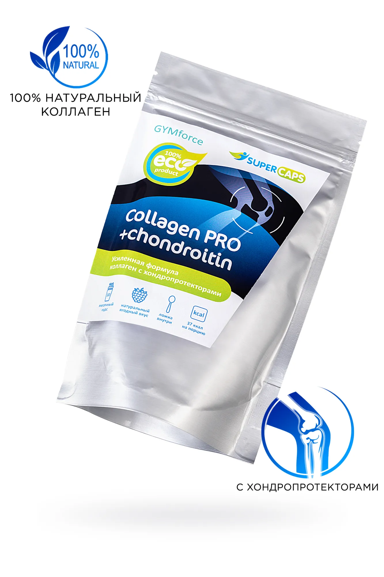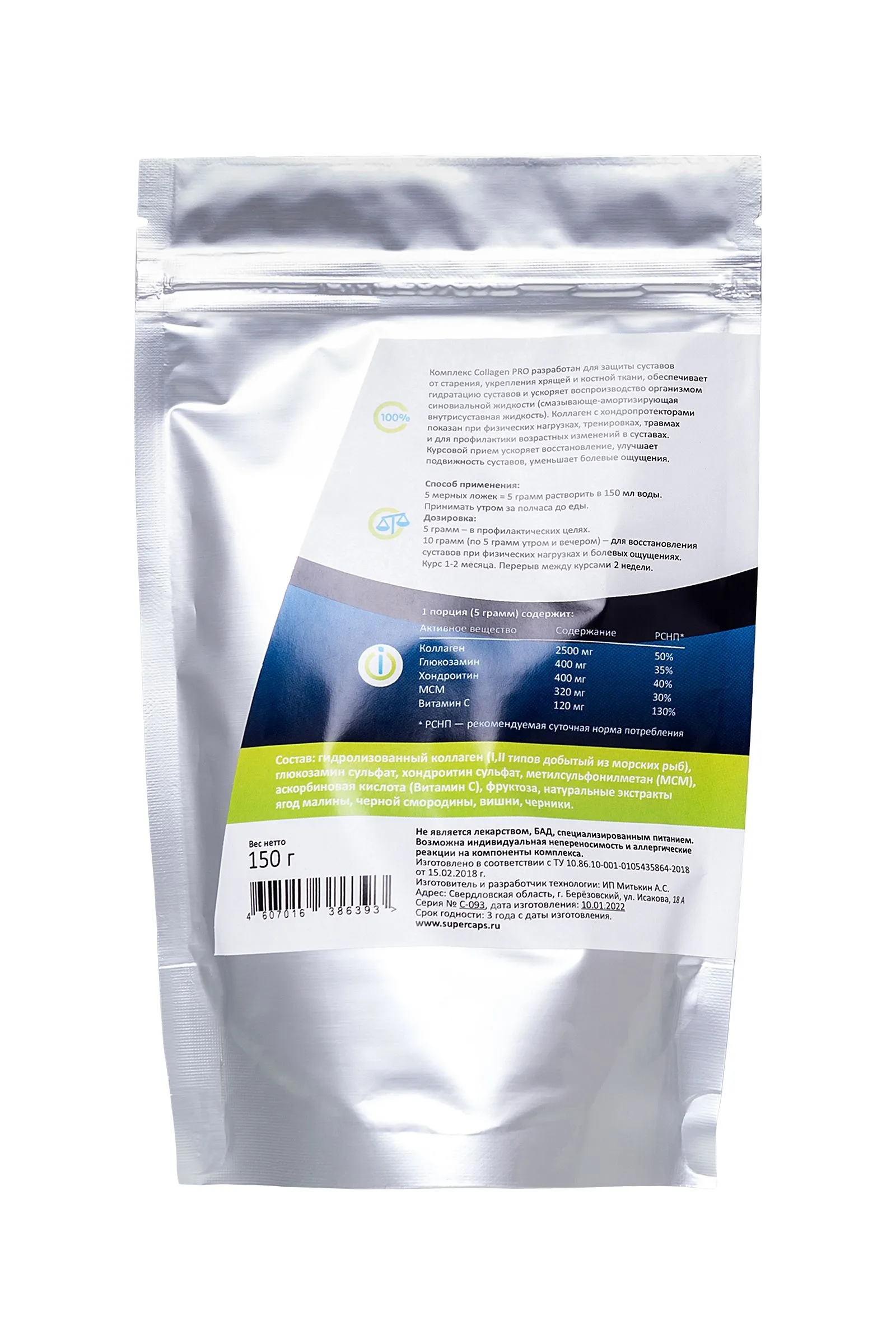 Collagen PRO SuperCaps – новейший beauty-продукт с хондропротекторами для здоровья. Коллаген – фибриллярный белок человеческого организма, который составляет основную часть соединительной ткани. Он является структурным элементом мышц, суставов, кожи. К сожалению с возрастом выработка коллагена в организме снижается, поэтому SuperCups разработал линейку продуктов из коллагена для поддержания здоровья организма. Комплекс Collagen PRO разработан для защиты суставов от старения, укрепления хрящей и костной ткани, обеспечивает гидратацию суставов и ускоряет воспроизводство организмом синовиальной жидкости (смазывающе-амортизирующая внутрисуставная жидкость). Коллаген с хондропротекторами показан при физических нагрузках, тренировках, травмах и для профилактики возрастных изменений в суставах. Курсовой прием ускоряет восстановление, улучшает подвижность суставов, уменьшает болевые ощущения. Продукт содержит 100% натуральный коллаген премиального качества, добытый из морепродуктов и рыб. Морской коллаген наиболее близок по структуре к человеческому коллагену, поэтому имеет самую высокую усвояемость организмом. Комплекс из морского коллагена, усиленный витамином С (экстракт алтайского шиповника), обладает общим омолаживающим эффектом, укрепляет суставы, улучшает состояние волос и ногтей, является белковым питанием для кожи и мышц. Способ применения: 5 мерных ложек = 5 грамм. Растворить в 150 мл воды. Принимать утром, за полчаса до еды. Дозировка: 5 грамм – в профилактических целях. 10 грамм (по 5 гр утром и вечером) – для восстановления суставов при физических нагрузках и болевых ощущениях. Курс 1-2 месяца. Перерыв между курсами 2 недели. 1 порция (5 грамм) содержит: Коллаген - 2500 мг Глюкозамин - 400 мг Хондроитин - 400 мг МСМ - 320 мг Витамин С - 120 мг Калорийность 1 порции - 37 ккал. Состав: Гидролизованный коллаген (I,II типов добытый из морских рыб), глюкозамин сульфат, хондроитин сульфат, метилсульфонилметан (MCM), аскорбиновая кислота (Витамин С), фруктоза, натуральные экстракты ягод малины, черной смородины, вишни, черники. Не является лекарством, БАД. Возможна индивидуальная непереносимость и аллергические реакции на компоненты комплекса.