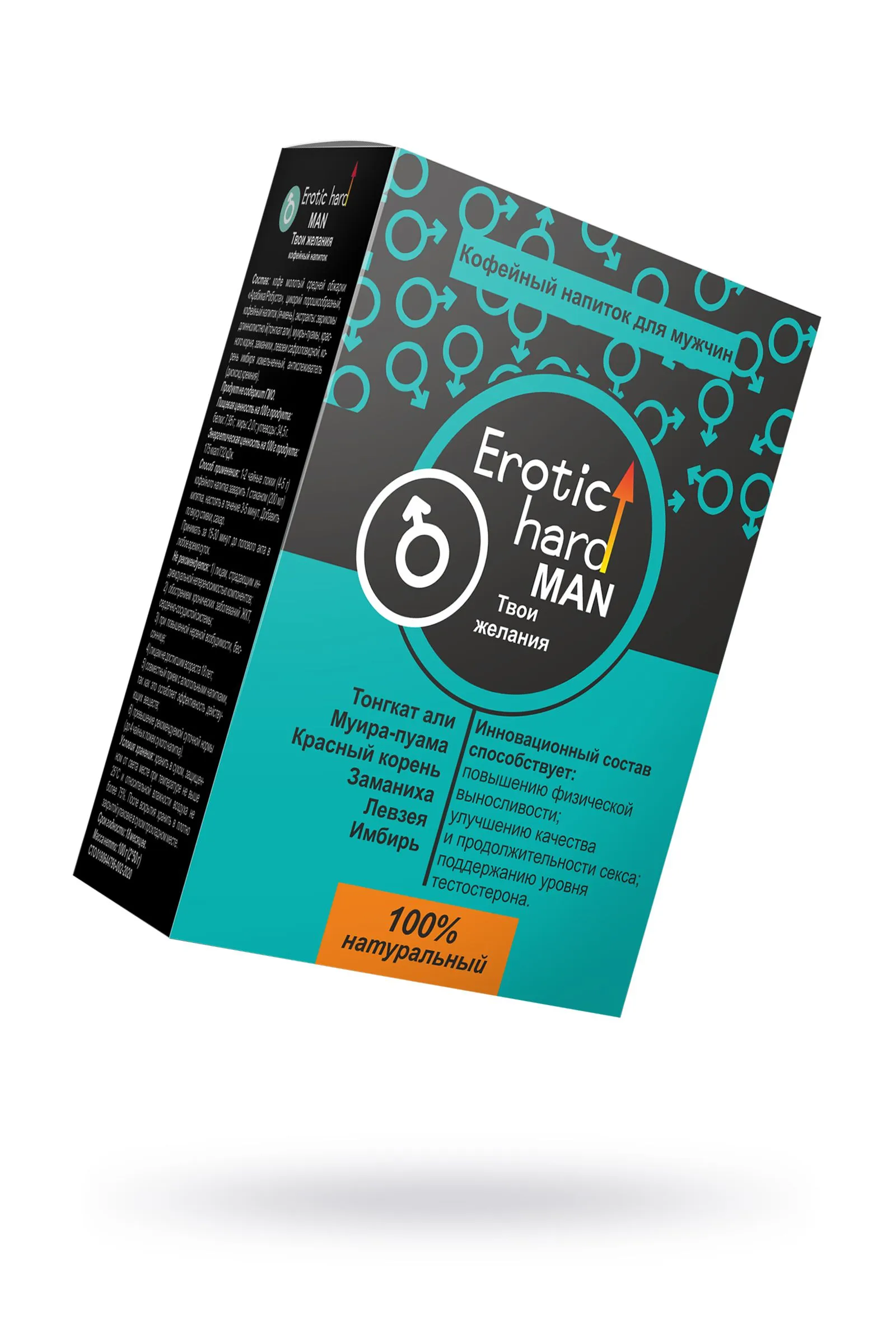 Кофейный напиток Erotic hard “MAN. Твои желания” с растительными экстрактами — это 100% натуральный продукт. Рекомендуется мужчинам для: повышения либидо, сексуальности, физической выносливости увеличения продолжительности полового акта, поддержания уровня тестостерона и репродуктивной функции, улучшения настроения, работоспособности уменьшения депрессивных состояний. Кроме того, Erotic hard “MAN. Твои желания” рекомендуется в качестве источника, минералов, микроэлементов, антиоксидантов, а особенно витамина Е и цинка, аминокислот и фитонутриентов. Эти необходимые элементы поддерживают сексуальную функцию, гормональный баланс и сохраняют мужское здоровье. Кофейный напиток благодаря своему составу оказывает положительное воздействие не только на мочеполовую, но и на центральную нервную, сердечно-сосудистую и эндокринную системы, что способствует общему омоложению организма. У напитка яркий, терпкий вкус насыщенного черного кофе с горчинкой цикория и тонкими растительными нотками. 6 растительных афродизиаков для великолепной потенции: эврикома длиннолистная (тонгкат али), муира-пуама, заманиха, красный корнень, левзея сафроловидная, имбирь молотый. Кофейный напиток Erotic hard «MAN. Твои желания» - всегда высшая лига! Способ применения: насыпать в чашку 1-2 чайные ложки кофе, залить кипятком, дать настояться не менее 3-5 минут, добавить по вашему вкусу сахар, сливки и подарить себе удовольствие от каждого глотка. Выпейте напиток за 15-30 минут до интимной близости. Состав: Кофе черный молотый средней обжарки "Арабика/Робос", цикорий порошкообразный, кофейный напиток (ячмень), экстракты: эврикомы длиннолистной (тонкат али), мури-пуамы, заманихи, красного корня, левзеи сафроловидной, корень имбиря молотый, антислеживатель (диоксид кремния) Противопоказания: бессонница, индивидуальная непереносимость, повышенная нервная возбудимость. Форма выпуска: кофейный напиток молотый, вес 100 гр. Условия хранения: хранить в сухом месте при температуре не выше 25 °С. БАД. НЕ ЯВЛЯЕТСЯ ЛЕКАРСТВЕННЫМ СРЕДСТВОМ