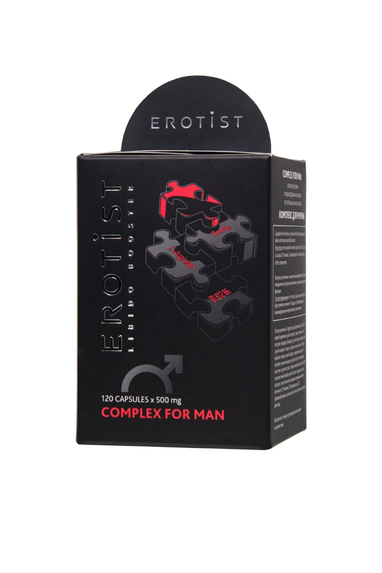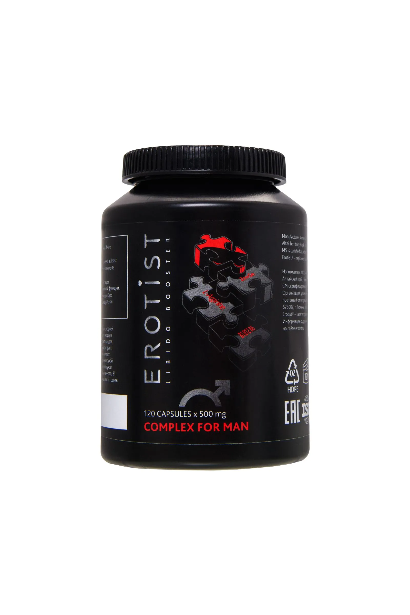 Сексуальная сила и выносливость – залог успешной интимной жизни и количества восхищенных женщин. Erotist Booster на страже твоего сексуального здоровья и долголетия. Пищевая добавка на основе растительных компонентов COMPLEX FOR MAN – это уникальное сочетание экстрактов 14 целебных трав и природных компонентов, совместная эффективность которых способствует повышению сексуального влечения и улучшению эректильной функции. Пищевая добавка обеспечивает поступление целого комплекса действующих веществ, запускает механизмы, направленные на повышение эрекции и усиление полового влечения, благоприятно воздействуя на выработку спермы и препятствуя преждевременной эякуляции, восстановлению мужской энергии, повышению потенции и продлению продолжительности полового акта. Активный комплекс пролонгированного действия основан на растительных компонентах. Благодаря сбалансированному составу обеспечивает натуральным зарядом бодрости и сил с самого утра и на весь день, повышает работоспособность и концентрацию, улучшает работу мозга, увеличивает естественный уровень сексуального желания и приводит в тонус мужскую силу. Активные компоненты не только воздействуют на проблему в комплексе, но и эффективны при многих нарушениях половой функции и сексуальных дисфункциях невротического характера, способствуя: повышению мужской потенции и сексуальной выносливости преодолению половой слабости наслаждению полнотой и яркостью сексуальных отношений увеличению либидо поддержанию отличного физического и умственного состояния. Комплекс рекомендуется использовать для восполнения дефицита минеральных компонентов и витаминов, развивающегося на фоне следующих состояний: при преждевременной эякуляции при бесплодии при половом инфантилизме при аденоме предстательной железы при простатите в острой и хронической форме при гормональных нарушениях (ослабление половой функции, нарушение эрекции, снижение либидо) при проблемах с мочеиспусканием (задержка мочеотделения и др.) при ослаблении иммунитета. Рекомендации по применению: при регулярной сексуальной активности взрослым мужчинам рекомендуется ежедневный прием по 1 капсуле 2 раза в день во время еды. Курс приема не менее 8-10 недель. Не содержит гормонов, не вызывает привыкания. Основные действующие компоненты: Аргинин (L-Arginine) – способствует увеличению в крови количества свободного NO. Окись азота выступает самым мощным природным вазодилататором. Благодаря этой функции удается улучшить микроциркуляцию в области органов малого таза, что ведет к усилению эрекции и продлению полового акта. Расширяет кровеносные сосуды полового члена и усиливает приток крови к органам малого таза. В результате этого у мужчины возникает твердая и длительная эрекция, увеличивается продолжительность полового акта. Помимо улучшения потенции, аргинин влияет на состав спермы и предотвращает мужское бесплодие. Йохимбе кора относится к афродизиакам, способным восстановить потенцию. Для возникновения эрекции необходимо расслабление гладкомышечного слоя пещеристых тел и артериол. Сексуальное возбуждение запускает каскад реакций, стимулирует нервные окончания и высвобождает оксид азота (NO). NO, в свою очередь, активирует ферментативные системы, увеличивающие уровень циклического гуанозинмонофосфата (цГМФ