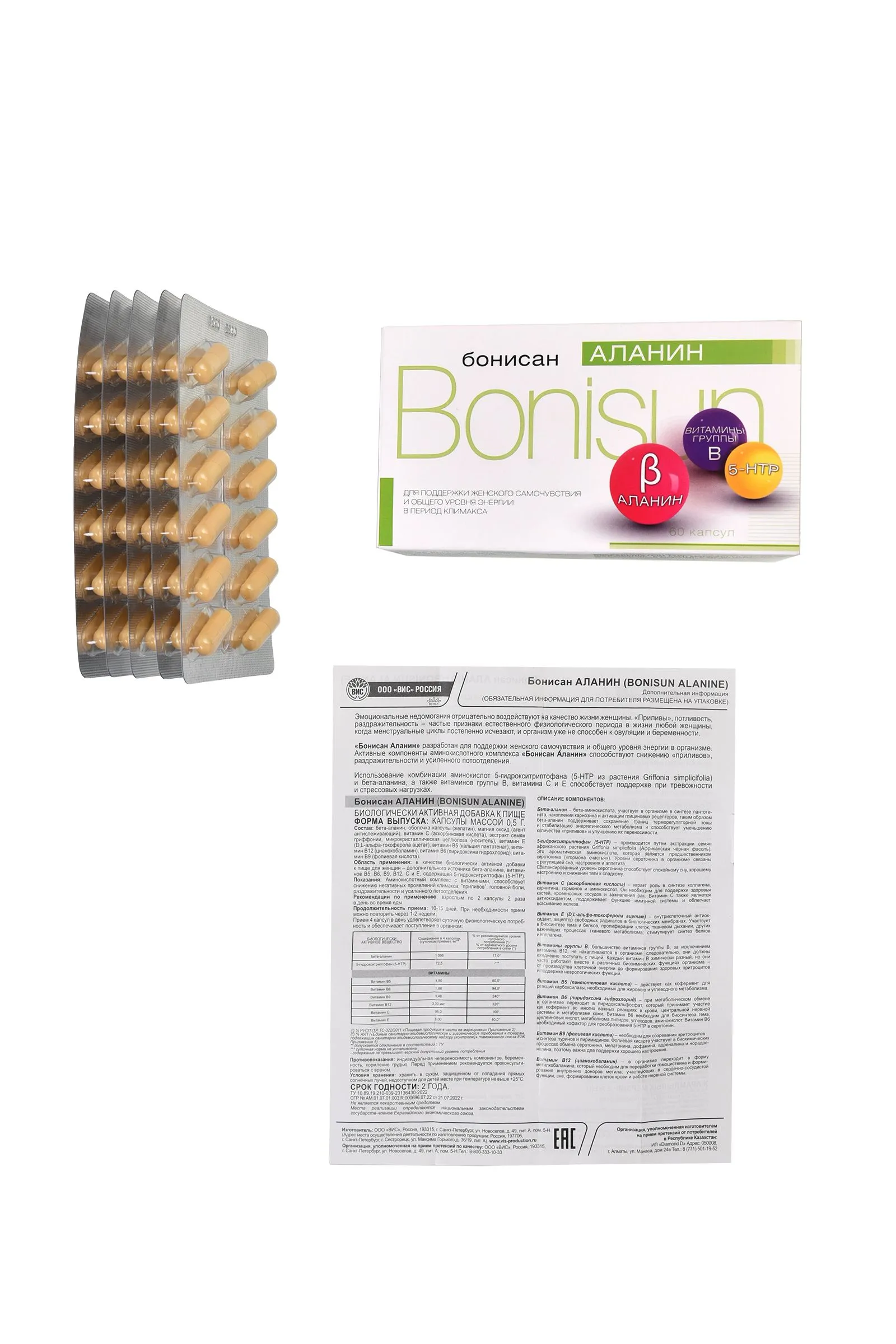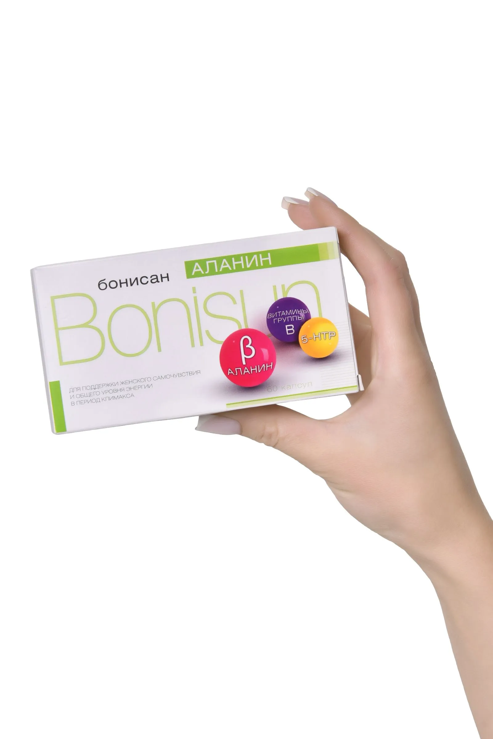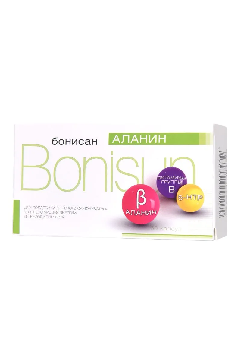 Каждая женщина сталкивается с жизненным этапом, когда менструальный цикл угасает. Бонисан Аланин создан специально для поддержания женского самочувствия и общего уровня энергии в период менопаузы. Активные компоненты аминокислотного комплекса с витаминами Бонисан Аланин способствуют снижению негативных “приливов”, головной боли, раздражительности и усиленного потоотделения. Биологически активная добавка к пище Бонисан Аланин входит в ТОП-10 категории “Климакс (менопауза) негормональные средства. В отличие от других известных препаратов аналогичного действия Бонисан Аланин выпускается в капсулах (в упаковке 60 капсул) и имеет комбинированный состав – источник бета-аланина, витаминов В5, В6, В9, В12, С и Е, содержит 5-гидрокситриптофан (5-НТР). В отличие от фитоэстрогенов бета-аланин обеспечивает быстрое купирование приливов (улучшение наступает в течение 10–30 мин, при тяжелой форме — в течение 2 часов). Метаболиты бета-аланина снижают вероятность приливов и оказывают долговременный эффект. Эффективность Бонисан Аланин наблюдается уже с первых дней приема: количество “приливов” уменьшается, а переносимость – улучшается. нормализуется сон, настроение и аппетит. Тяга к сладкому заметно снижается. эмоциональный фон выравнивается, нервная система успокаивается. профилактика витамина В5, В6, В12 Российское общество акушеров-гинекологов рекомендует применение негормональных растительных и альтернативных средств: цимицифугу кистевидную, бета-аланин и др. для женщин с легкими или умеренными симптомами, которые имеют противопоказания или не хотят использовать менопаузальную гормональную терапию. Рекомендации по применению: Взрослым по 2 капсулы 2 раза в день во время еды. Продолжительность приема: 10-15 дней. При необходимости прием можно повторить через 1-2 недели. Состав: Бета-аланин, оболочка капсулы (желатин (Е441) или гидроксипропилметилцеллюлоза (Е464) с добавлением или без добавления пищевых красителей), магния оксид (Е530, агент антислеживающий), витамин С (аскорбиновая кислота), экстракт семян гриффонии, микрокристаллическая целлюлоза (Е460, носитель), витамин Е (D,L-альфа-токоферола ацетат), витамин В5 (кальция пантотенат), витамин В12 (цианокобаламин), витамин В6 (пиридоксина гидрохлорид), витамин В9 (фолиевая кислота). Противопоказания: Индивидуальная непереносимость компонентов, беременность, кормление грудью. Форма выпуска: капсулы 0,5 г, в упаковке 60 шт. Условия хранения: хранить в сухом месте при температуре не выше 25 °С. БАД, НЕ ЯВЛЯЕТСЯ ЛЕКАРСТВЕННЫМ СРЕДСТВОМ