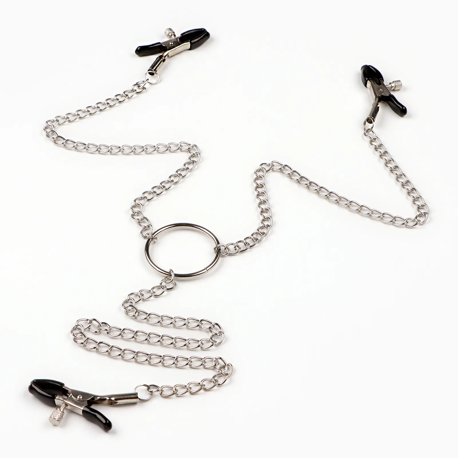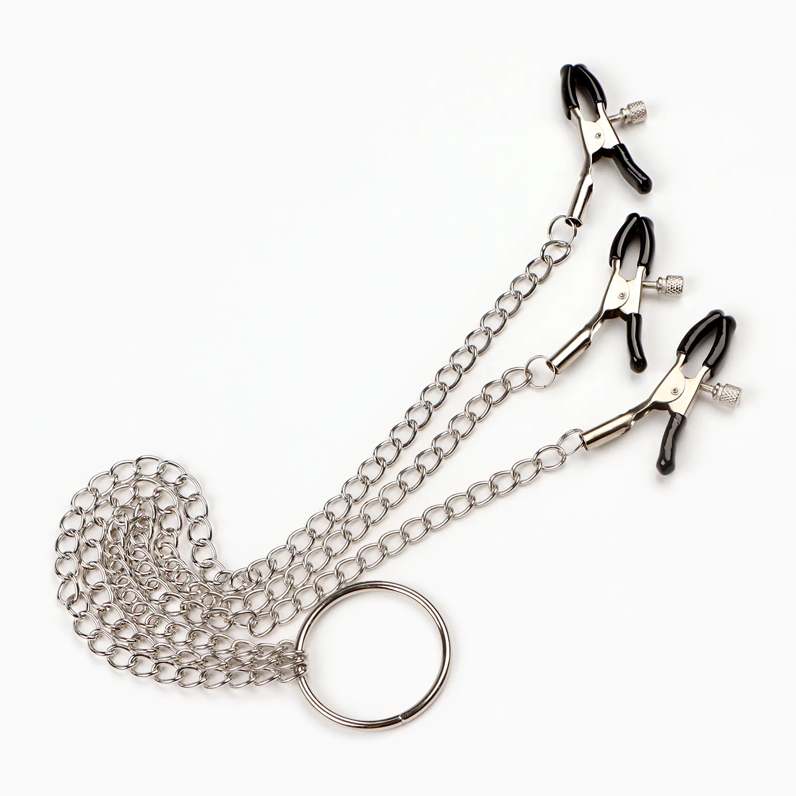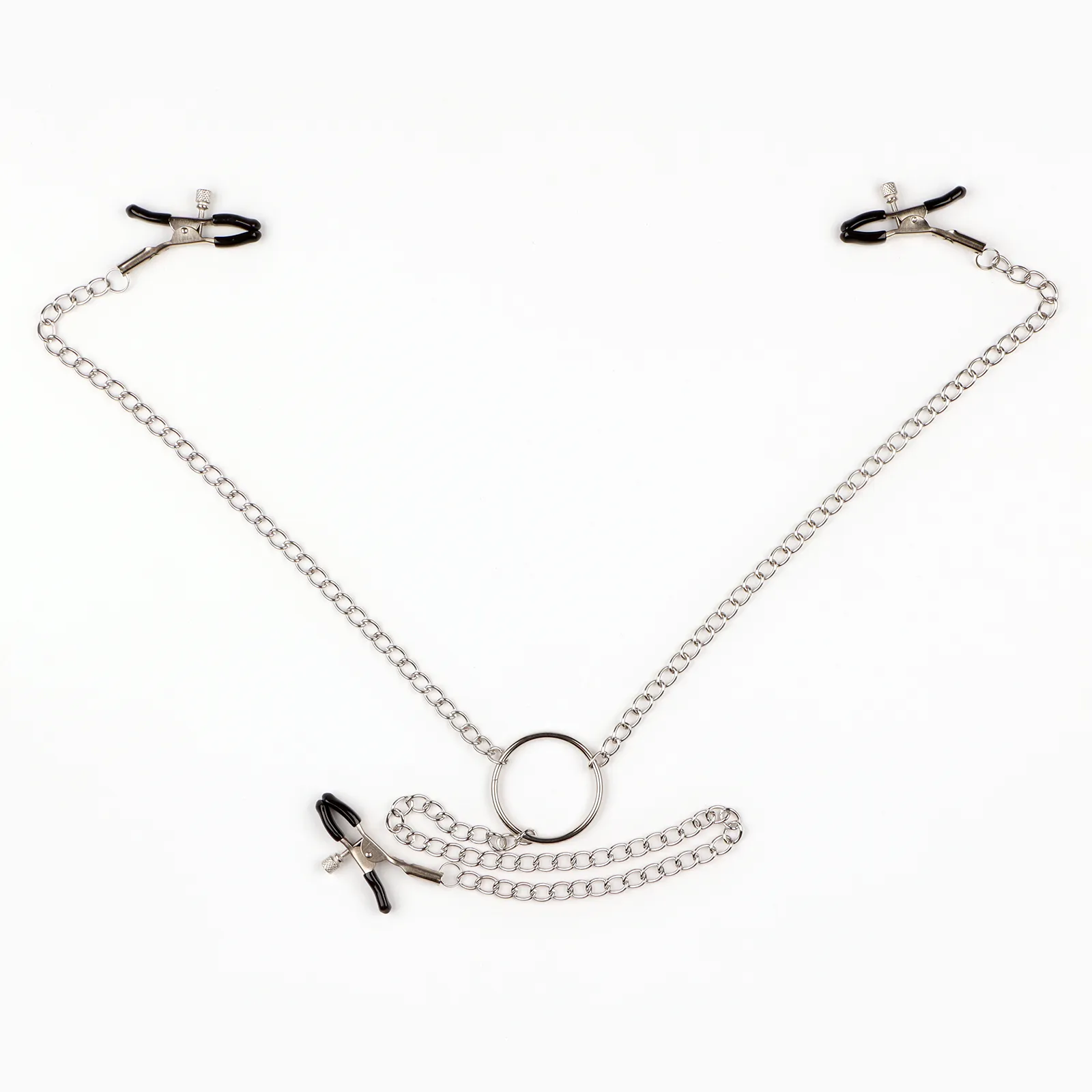 Зажимы для сосков и клитора изготовлены из алюминия, изделие имеет пластиковые наконечники. Длинная цепь позволяет одновременно использовать зажимы для сосков и клитора. Соединяющая цепочка является не только красивым дополнением, но и позволяет оттягивать и вращать соски для получения дополнительных приятных ощущений. Можно использовать как самостоятельный стимулятор, а также как дополнение к прелюдии и сексу.