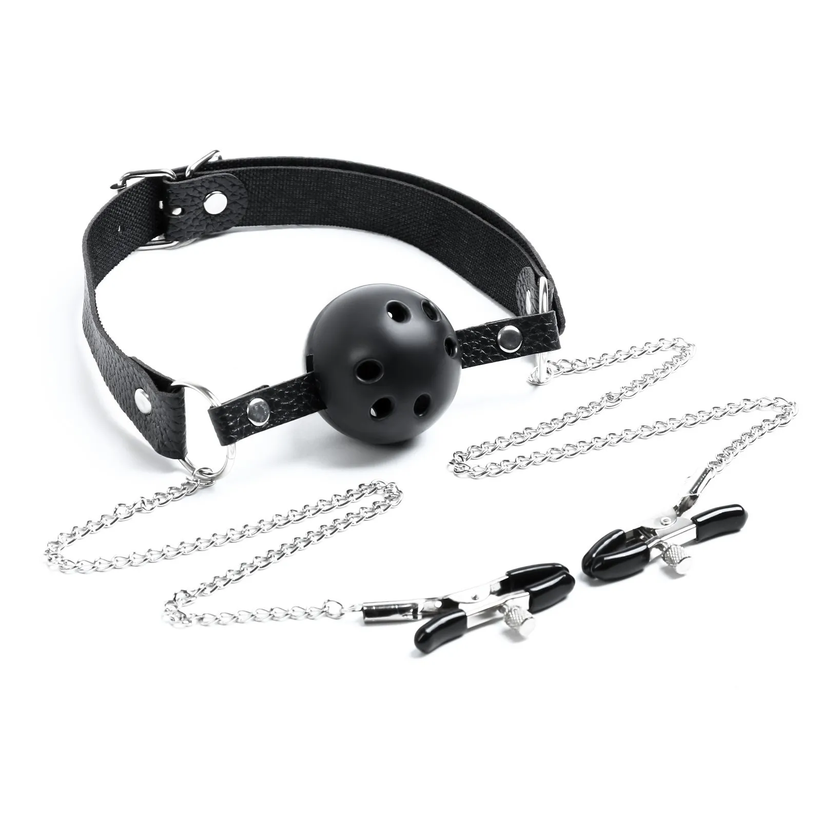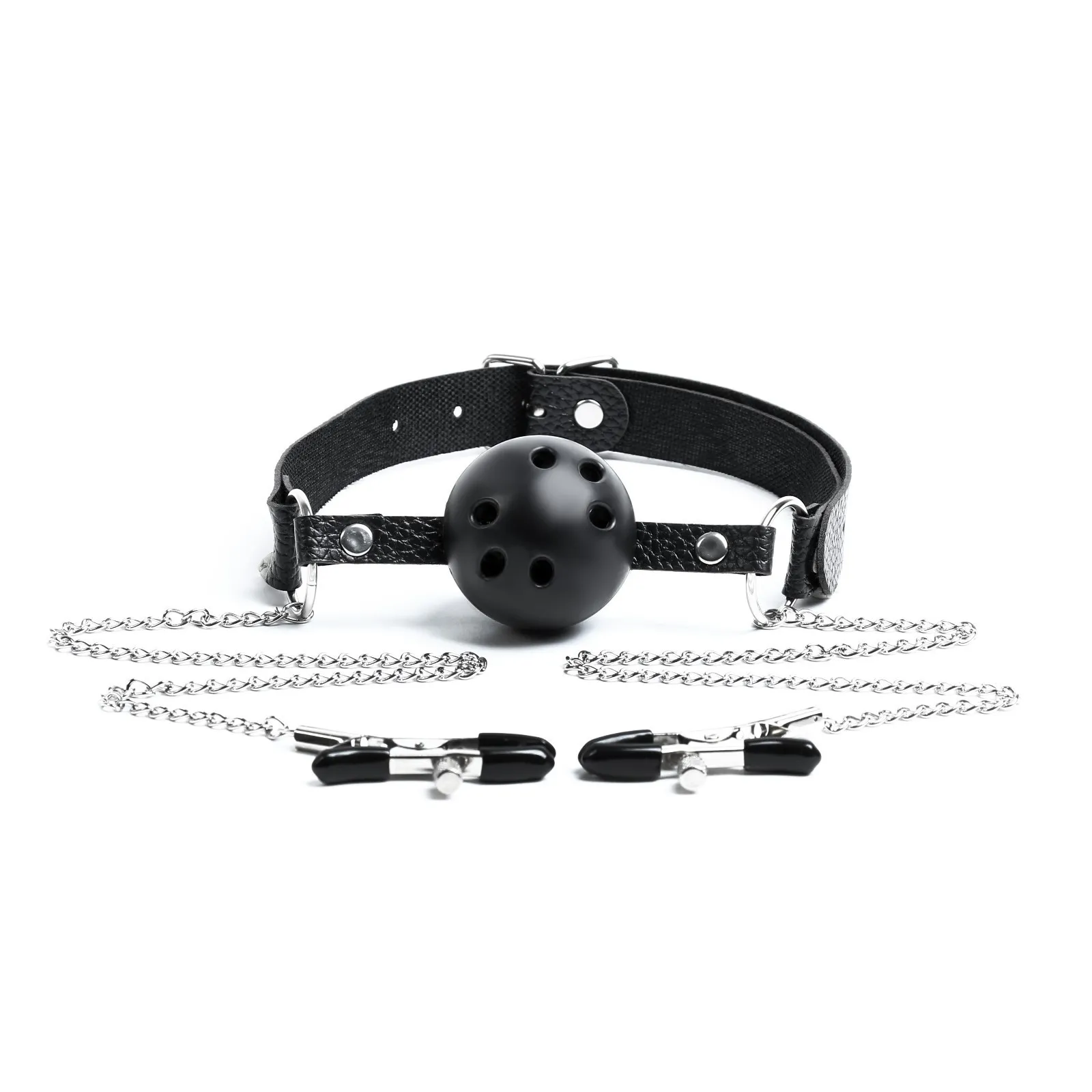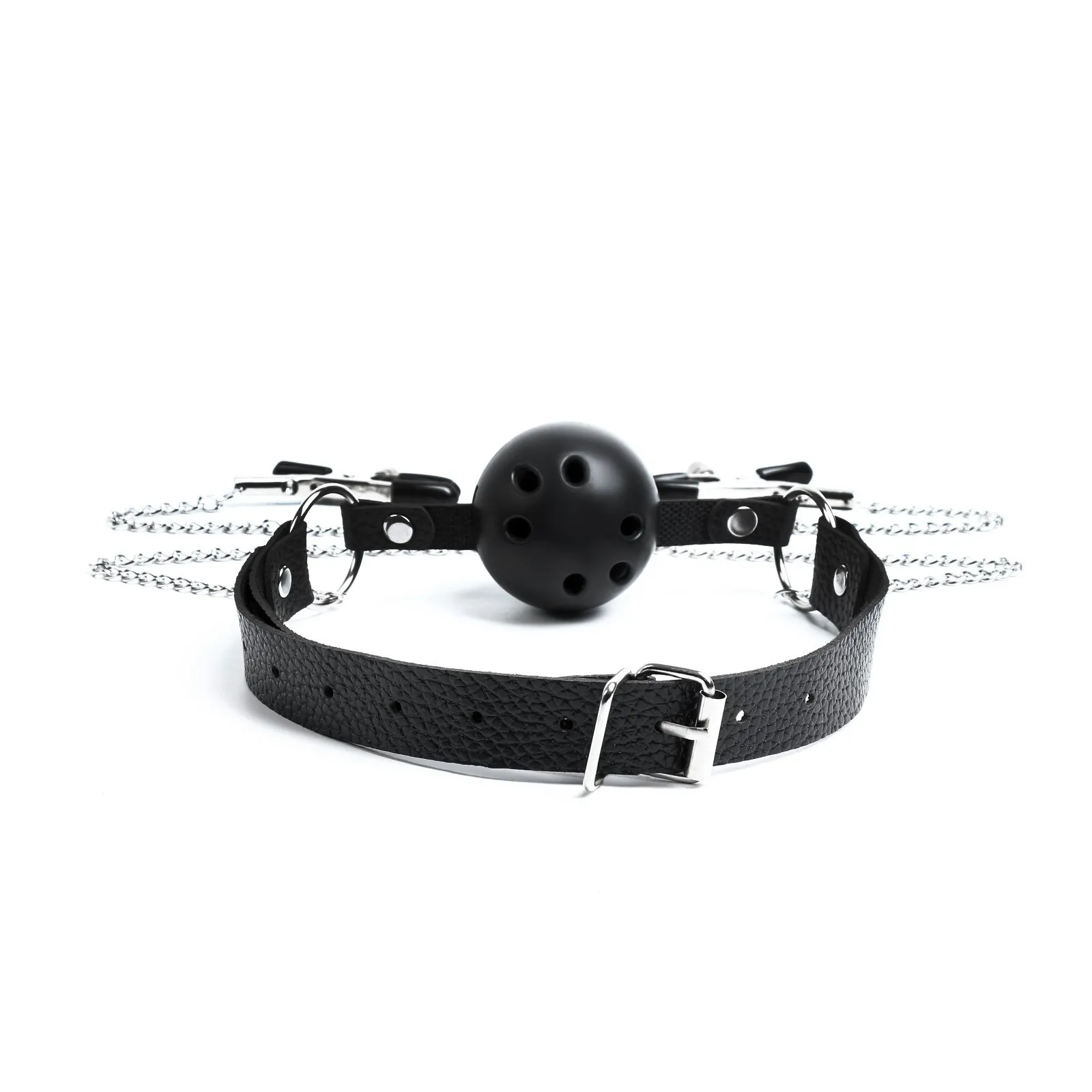 Кляп с зажимами для сосков. Выполнен из эко-кожи и abs пластика. Шарик имеет оптимальный размер, хорошо помещается в рот, а ремешок имеет систему регулировки, так что он подойдет и для нее и для него. Имеет длинную цепь и зажимы. Перед использованием необходимо помыть игрушку под проточной водой, далее обработать специальным спреем - клинером.