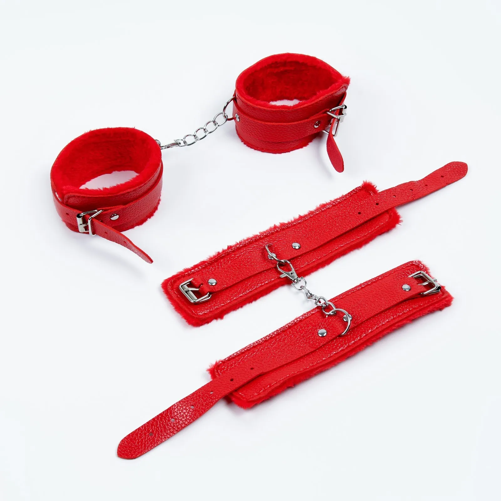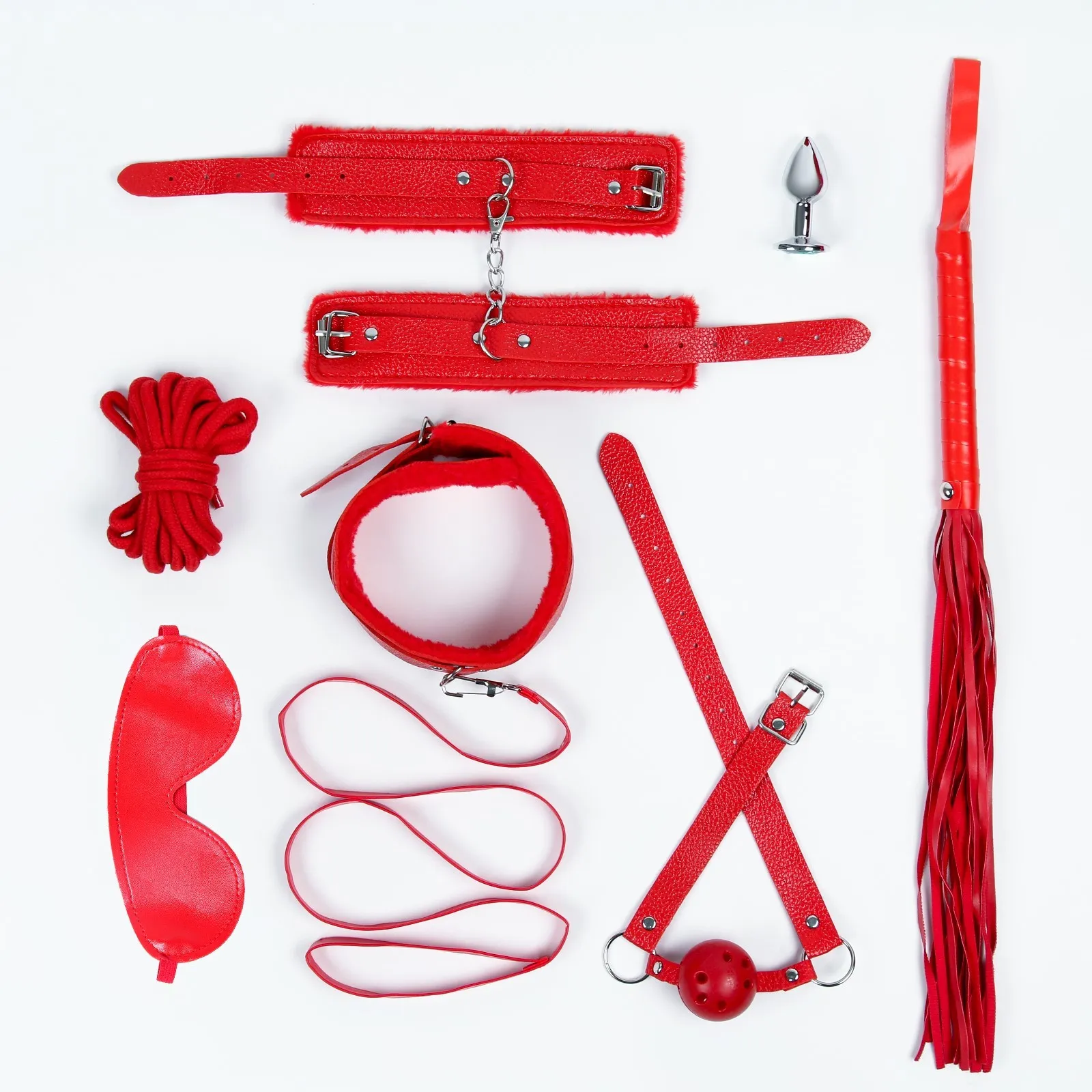 Кляп выполнен из эко-кожи и ABS-пластика. Шарик имеет оптимальный размер, хорошо помещается в рот, а ремешок имеет систему регулировки, так что он подойдет и для нее и для него. Наручники и ошейник с меховой вставкой, которая обеспечит приятное прилегание к телу. Поводок крепится к ошейнику при помощи карабина, имеет длину 103 см. Хлопковая верёвка для связывания 5 м. Анальная пробка из медицинской стали с кристаллом. Диаметр пробки 2,8 см небольшой размер поможет постепенно растянуть и подготовить мышцу к анальному сексу.