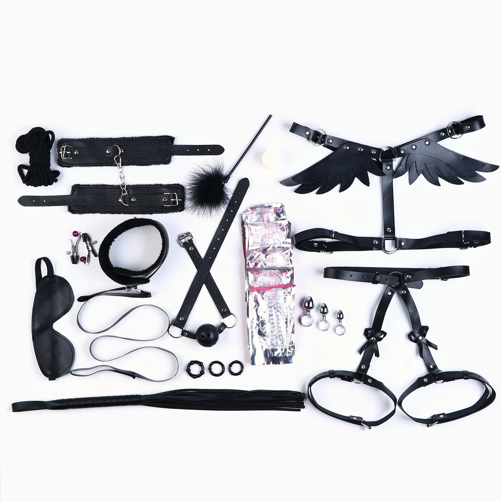 В состав набора входит 25 предметов: две портупеи,зажимы для сосков,свеча, кляп, плеть, ошейник с поводком, маска,набор анальных пробок, набор насадок , верёвка, наручники, набор эрекционных колец, пуховка.