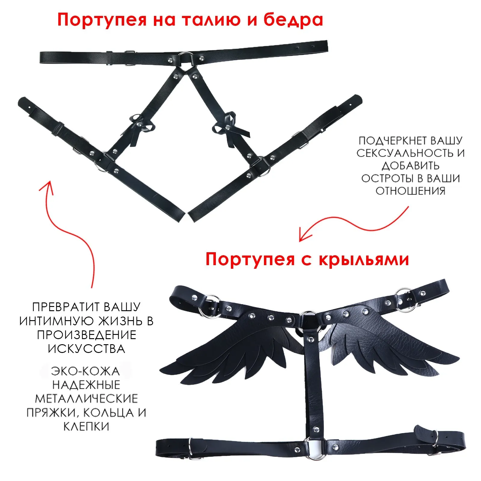 - Портупея выполнена из эко-кожи. При помощи ремней портупею можно регулировать, это обеспечит идеальную посадку изделия на теле. Она создаёт сексуальный узор на теле. Портупею можно носить на голое тело, в качестве нижнего белья, а также можно использовать как аксессуар.