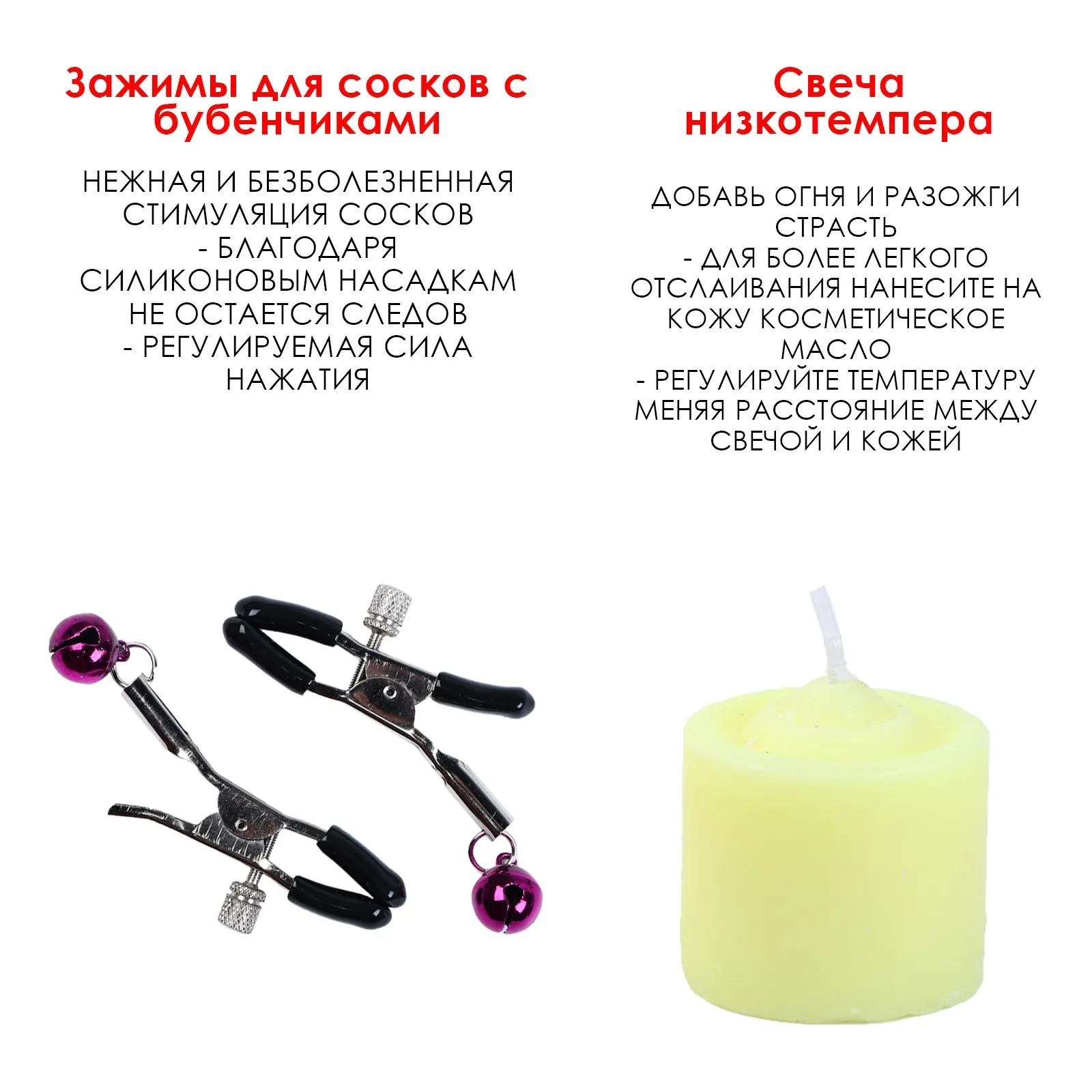 - Зажимы для сосков изготовлены из алюминия, изделие имеет пластиковые наконечники. Имеют аксессуар в виде бубенчиков. Можно использовать как самостоятельный стимулятор, а также как дополнение к прелюдии и сексу.