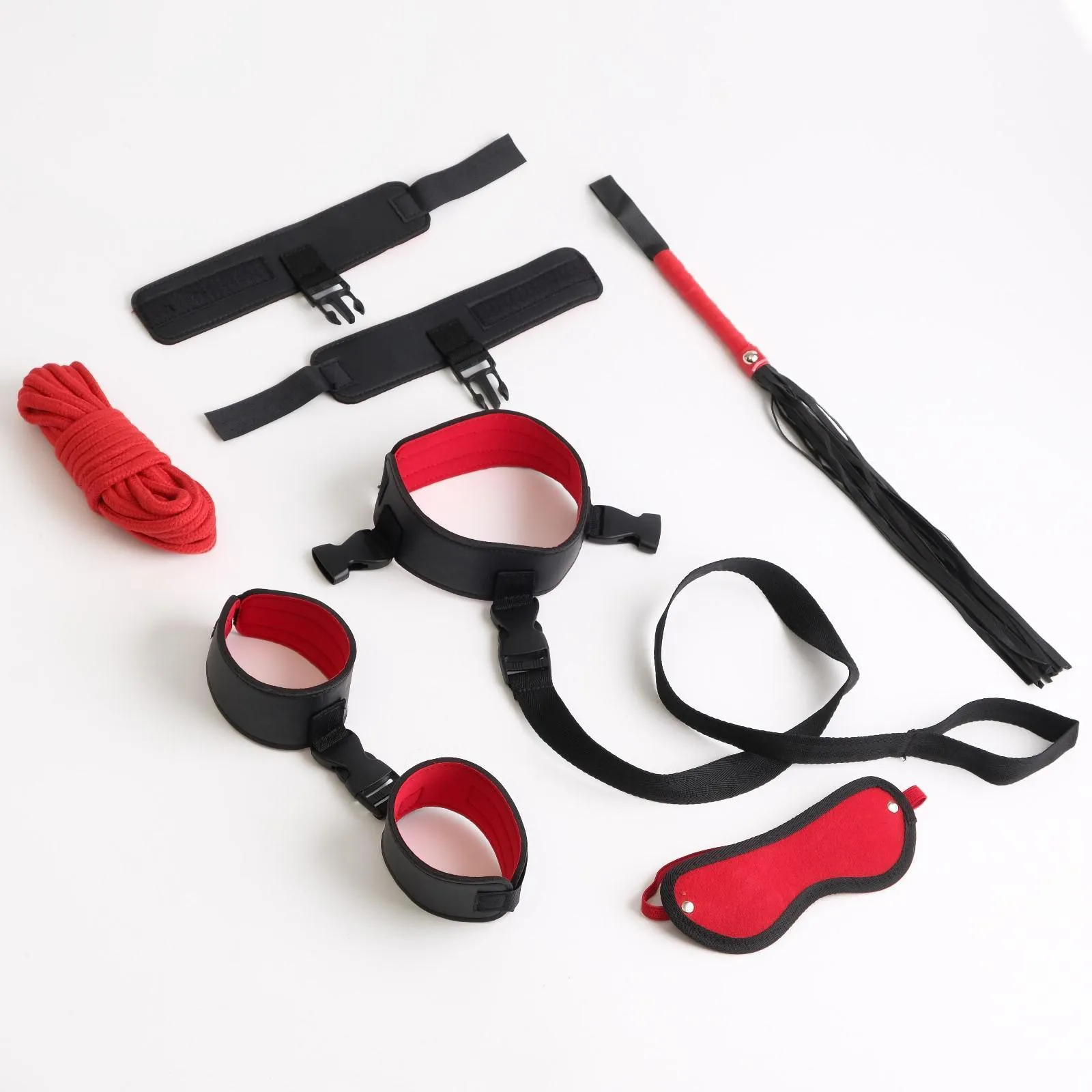 БДСМ набор выполнен из эко-кожи. В состав набора входят 7 предметов: наручники, оковы, ошейник, поводок, маска, верёвка, плеть.
