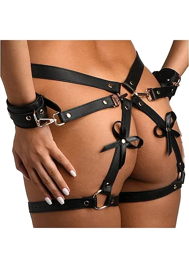 Очаровательные аксессуары для сексуальных игр и украшения своего партнера. Набедренная сбруя выполнена из мягкой экокожи и украшена бантиками. От поясной части идут перемычки, которые сковывают движения рук, если присоединить к ним наручи из комплекта.
