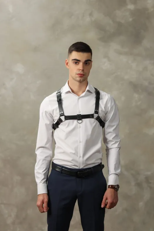 Стильная и необычная мужская портупея, полностью выполненная из натуральной кожи. Декорирована качественной металлической фурнитурой. Аксессуар двусторонний: его можно носить по разному, меняя положение по Вашему желанию. Стильный элемент для Вашего образа, который будет особенно эффектно смотреться на обнаженном мужском теле и возбуждать фантазию!