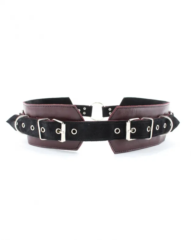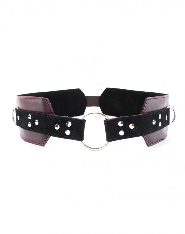 Пояс выполнен из натуральной кожи бордового цвета, декорирован ремнями из черной замши, тремя металлическими кольцами и четырьмя полукольцами. Сзади аксессуар надежно фиксируется пряжкой, ремни позволяют выбрать нужный размер. Мягкий подклад из замши обеспечит комфортное пребывание . Аксессуар позволяет в полной мере насладиться играми в стиле БДСМ.