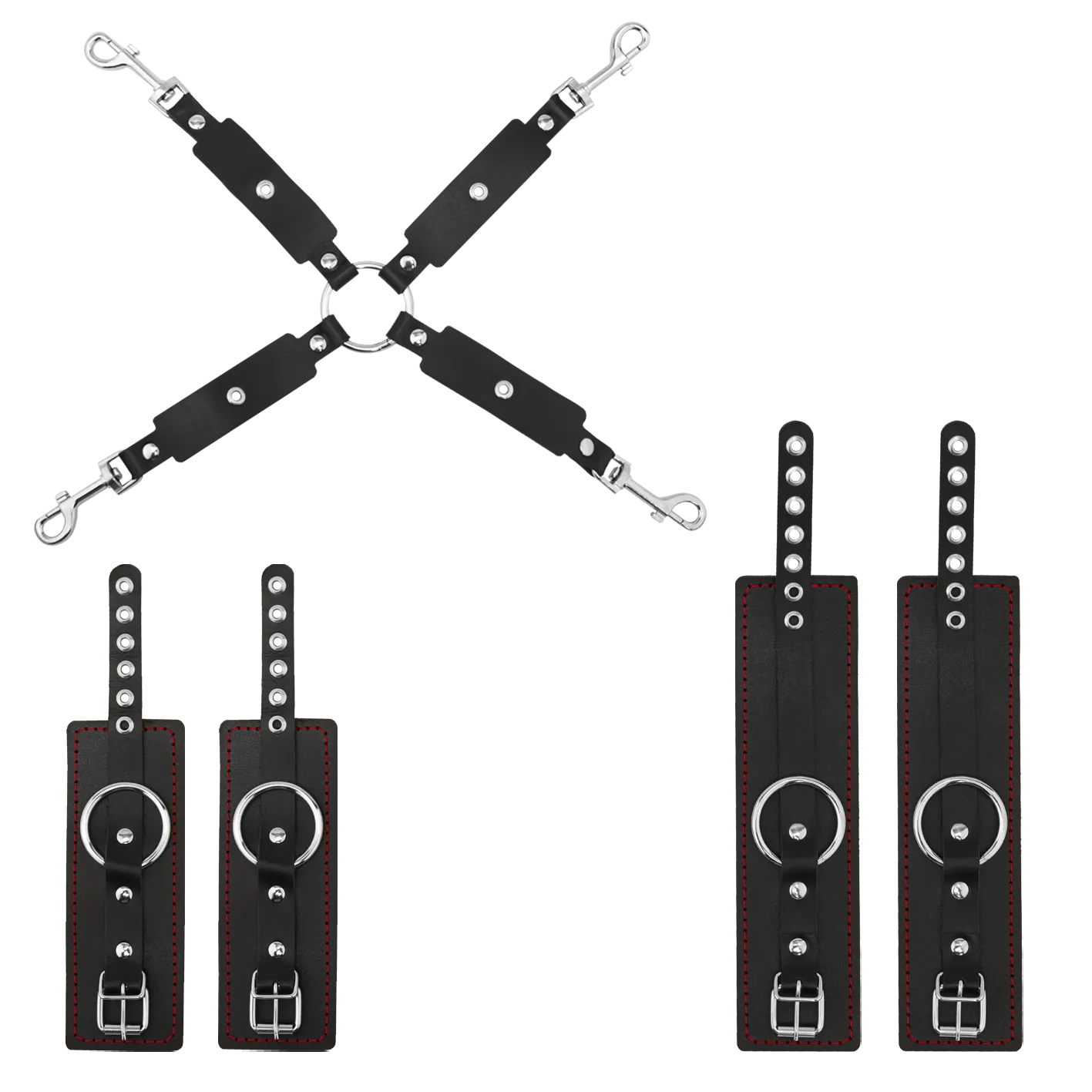 На каждом конце креста есть карабины, при помощи которых Вы сможете присоединить к ним наручники и поножи или же другие аксессуары. Однослойные наручники и оковы выполнены из натуральной кожи черного цвета и декорированы контрастной строчкой.