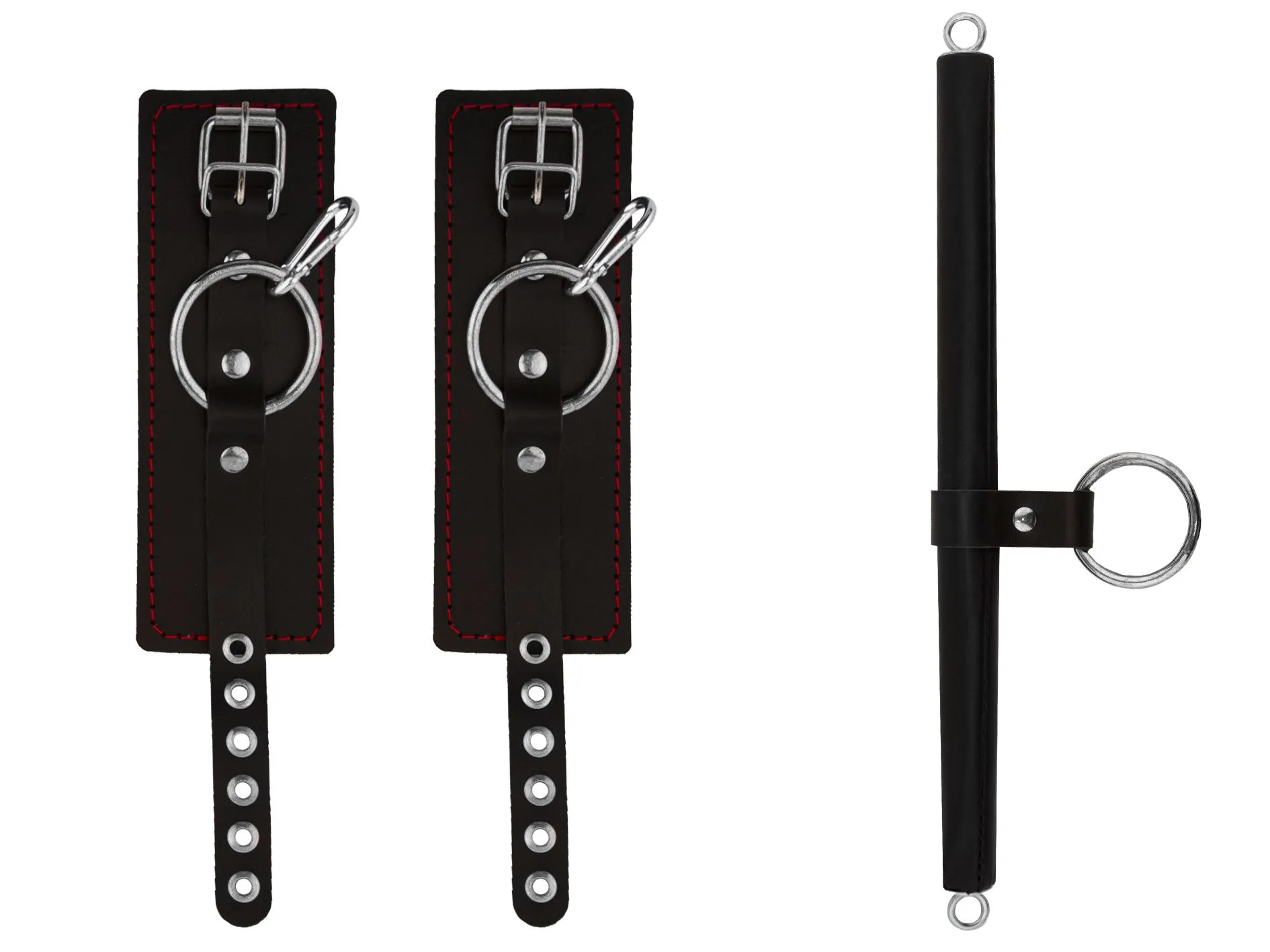 Распорка выполнена из дерева и обтянута натуральной кожей. Однослойные наручники также выполнены из натуральной кожи черного цвета и декорированы контрастной строчкой.