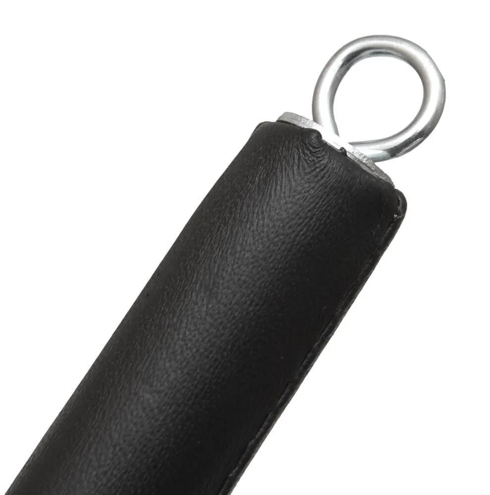 Распорка выполнена из дерева и обтянута натуральной кожей. Однослойные наручники и оковы также выполнены из натуральной кожи черного цвета и декорированы контрастной строчкой.