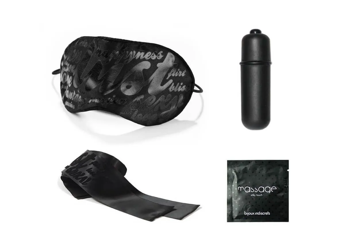 Создатели этого набора для удовольствий вдохновлялись знаменитым фильмом, поставленным по одноименному эротическому роману "Пятьдесят оттенков серого". В набор входят пластиковая вибропуля, сатиновая маска на глаза, сатиновая лента для связывания и небольшая упаковка массажного масла на силиконовой основе. Позвольте себе поэкспериментировать в постели вместе с аксессуарами из набора, чтобы получить максимум ощущений. Оденьте на своего партнера маску, чтобы он не видел Ваших приготовлений и в сладком волнении ожидал дальнейших действий, или же свяжите его и сделайте полностью беспомощным. При помощи вибропули простимулируйте внешние эрогенные зоны партнера, доводя его до пика наслаждения. А массажное масло позволит Вам провести незабываемый сеанс массажа, который возбудит вас обоих до предела.