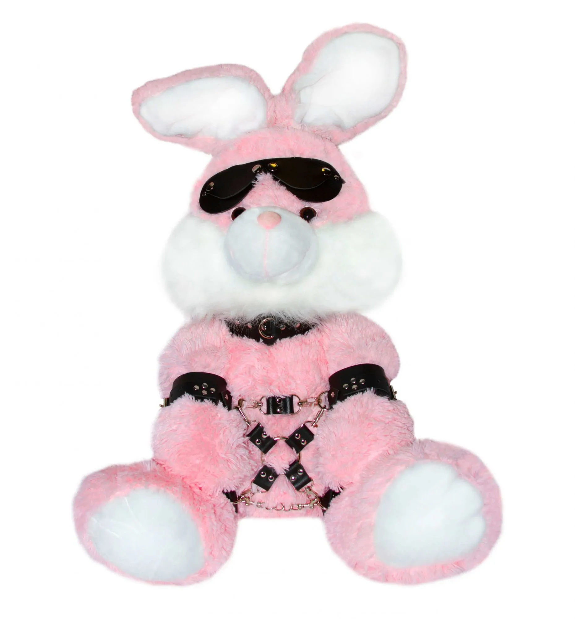 В комплекте: розовый зайка (60 см), крест с четырьмя карабинами, очки-шоры, ошейник, наручники, поножи.