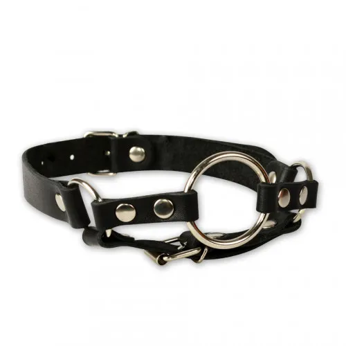 Кляп-рамка изготовлен из натуральной высококачественной кожи чёрного цвета. Внешний диаметр кольца 44 мм,. Зафиксировать и отрегулировать изделие можно при помощи металлической пряжки. Вся металлическая фурнитура имеет никелевое покрытие.
