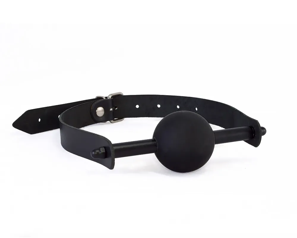 Кляп - шар изготовлен из термопластичного эластомера, диаметр 45 мм. Сфера удерживается металлической трубкой, к которй прикреплены ремешки из натуральной кожи. Кляп регулируется при помощи металлической пряжки. Размер универсальный.