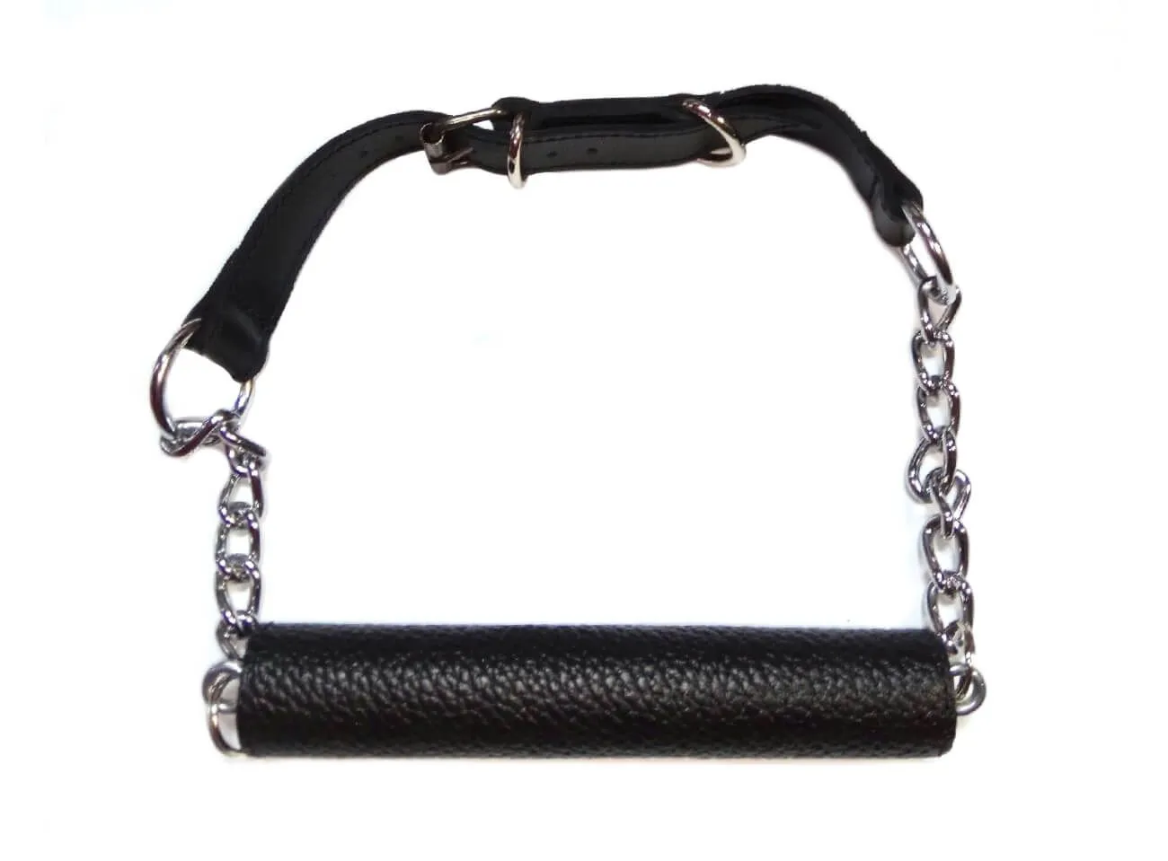 Трензель с цепями выполнен из натуральной кожи черного цвета. Ремешок регулируется по длине, поэтому его можно будет подогнать под нужный размер. Длина самого трензеля составляет 14 см.