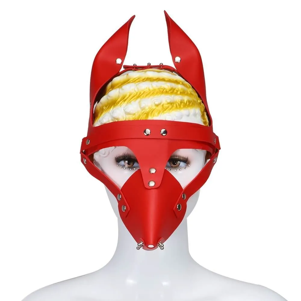Маска лисы выполнена из полиуретана красного цвета и металлической фурнитуры. Ее размер регулируется ремешком с пряжкой.