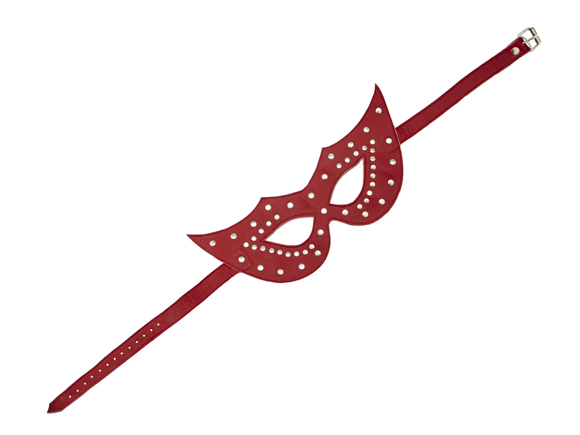 Маска ручной работы от компании "Подиум" сделана из натуральной красной кожи и по всей поверхности украшена металлическими заклепками. Такая маска отлично подойдет для деперсонализации - она даст Вам возможность отказаться от своей привычной социальной роли и буквально почувствовать себя другим человеком. Сбросив с себя груз ответственности, Вы сможете полностью отдаться незабываемым удовольствиям вместе со своим партнером!