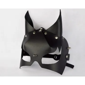 Маска изготовлена из натуральной кожи черного цвета и имеет объемную форму. Регулируется при помощи резинки и пластиковой пряжки. Металлическая фурнитура имеет никелевое покрытие.