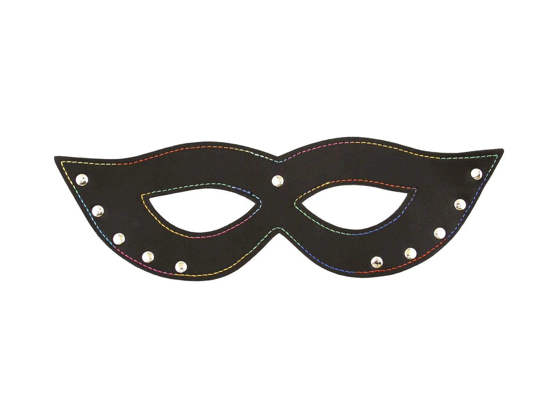 Мягкая открытая маска выполнена в черном цвете и прошита радужной нитью. Эта стильная маска понравится любителям игр с элементами БДСМ, а также тем, кто просто хочет попробовать что-то новое в постели. Она хоть и не сможет погрузить Вас в полную темноту, зато станет отличным аксессуаром для создания необходимой атмосферы во время ролевых игр. В ней Ваш образ будет более загадочным и страстным, что непременно по достоинству оценит Ваш партнер. Она также будет отличным дополнением к карнавальному костюму.
