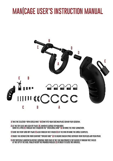 Благодаря легкому, прочному и гипоаллергенному материалу пояс идеально подходит для долговременного ношения. Изделие состоит из нескольких разборных частей: клетки, кольца и штифтов, которые идеально сочетаются друг с другом. В комплекте к поясу идет 4 кольца разных диаметров для разных размеров и предпочтений. Просто выберете подходящий размер кольца, соедините его тремя штифтами, оденьте на средний штифт специальную втулку и соедините с клеткой. На центральном штифте есть специальное отверстие для замка. Выберете один из замков и зафиксируйте пояс. Фиксация тонкой гибкой лентой высокой прочности гарантирует, что металлоискатели на пояс не среагируют.