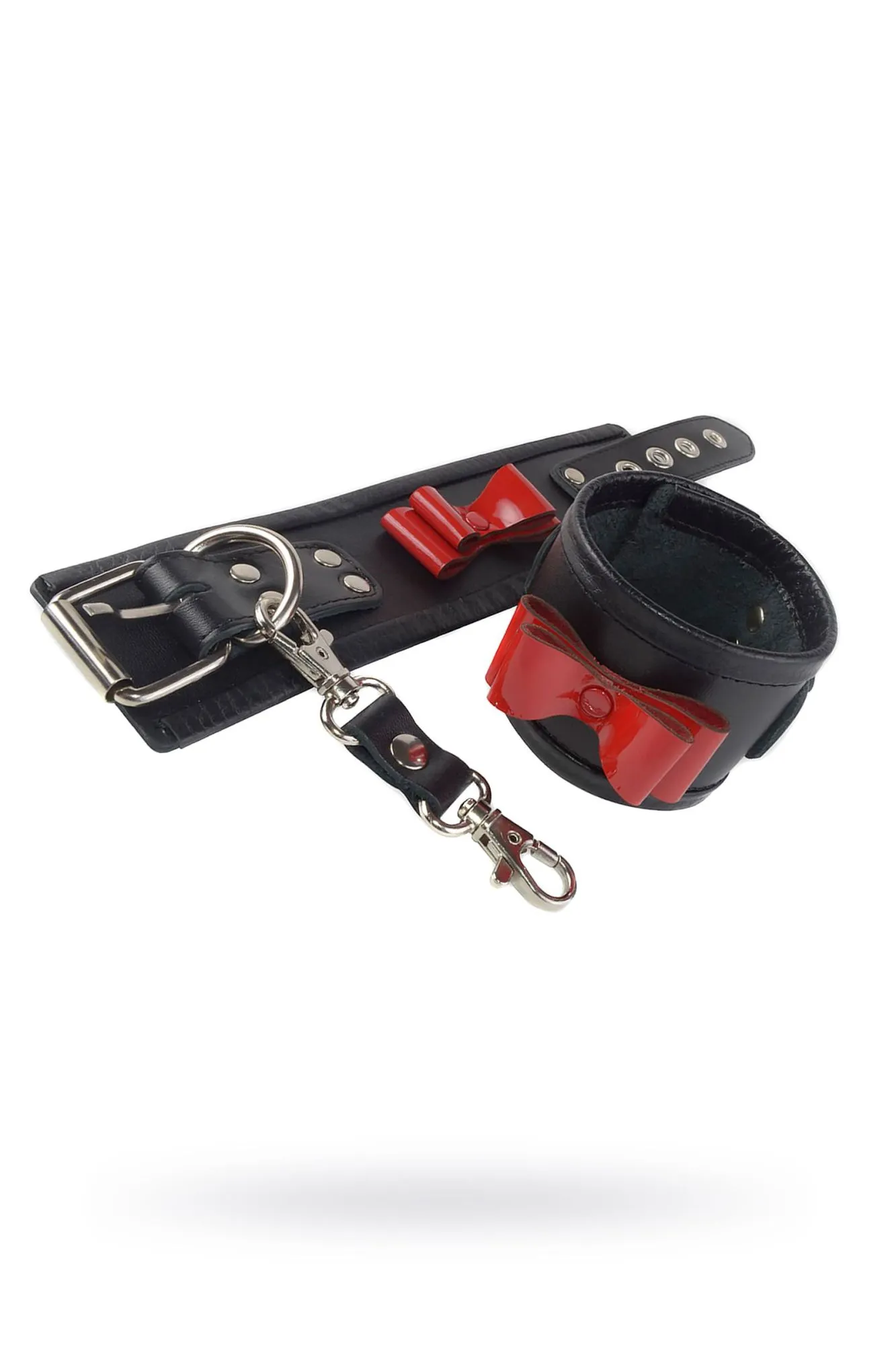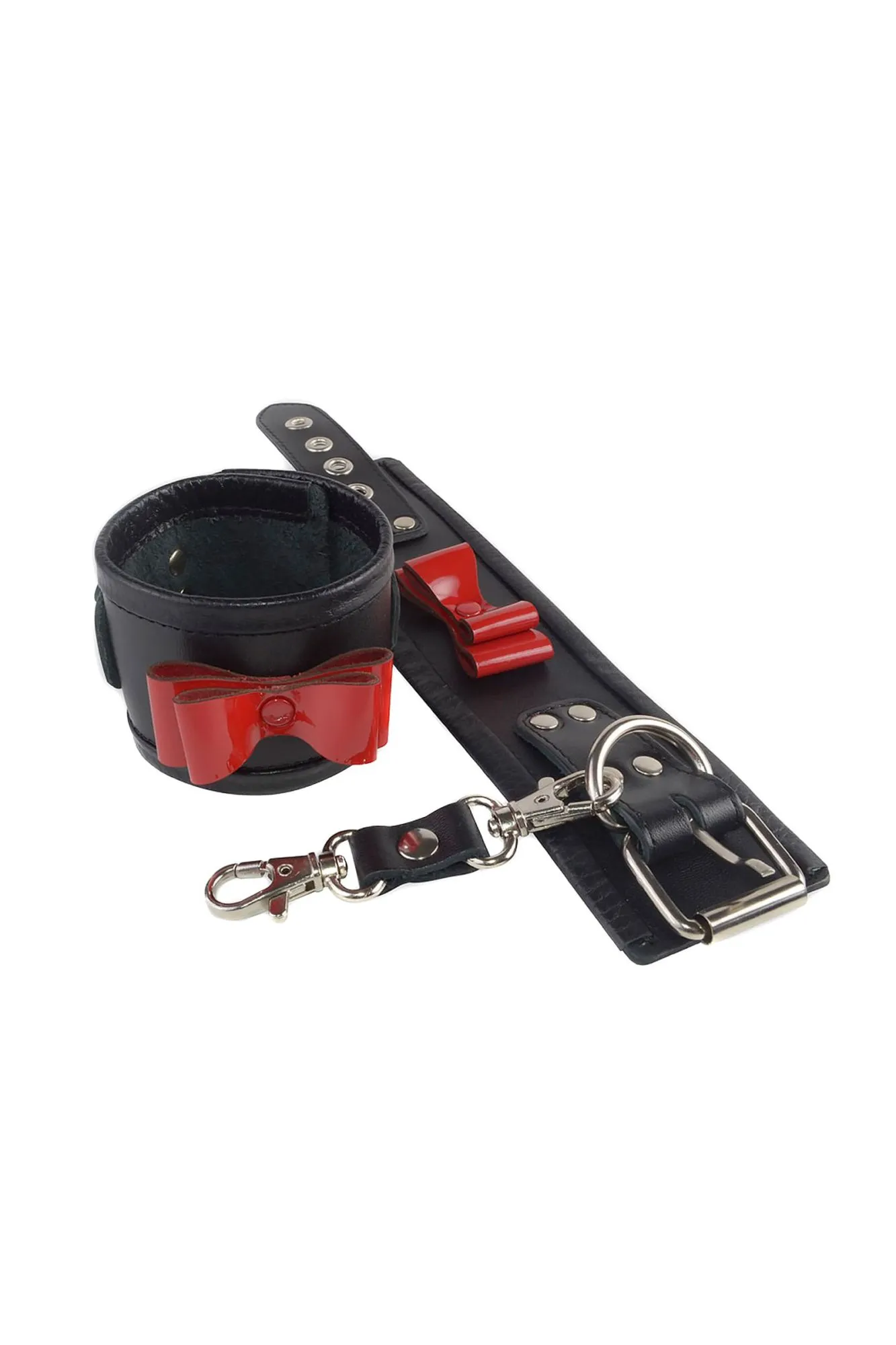 Черные наручники на запястьях секс-партнёра – это возбуждает, причём, заводит не только физическая скованность партнёра, но и психоэмоциональное подчинение. При помощи наручников каждый в паре найдёт для себя возможность реализовать внутреннюю потребность, которая, высвободившись, даёт ощущение крайнего наслаждения. Ситабелла представляет оригинальные наручники из натуральной высококачественной кожи, которые помогут не только ограничить подвижность, но и изящно украсят запястья рук. Объёмный, изящный бантик из натуральной лаковой красной кожи, придаёт наручникам кокетливости и лёгкой игривости. Отрегулировать по размеру девайс можно при помощи металлической пряжки. Вся используемая металлическая фурнитура имеет никелевое покрытие. На наручниках располагаются полукольца, для соединения их между собой при помощи двух карабинов, скреплённых кожаным ремешком. Общая длина наручников около 27 см Ширина 5,5 см