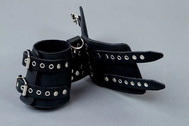 Манжеты сделаны из натуральной кожи черного цвета и декорированы металлическими клепками. Мягкая подкладка обеспечит их комфортное использование. Ремешки с пряжками позволят отрегулировать диаметр оков. Максимальный обхват - 26 см, минимальный - 18 см.