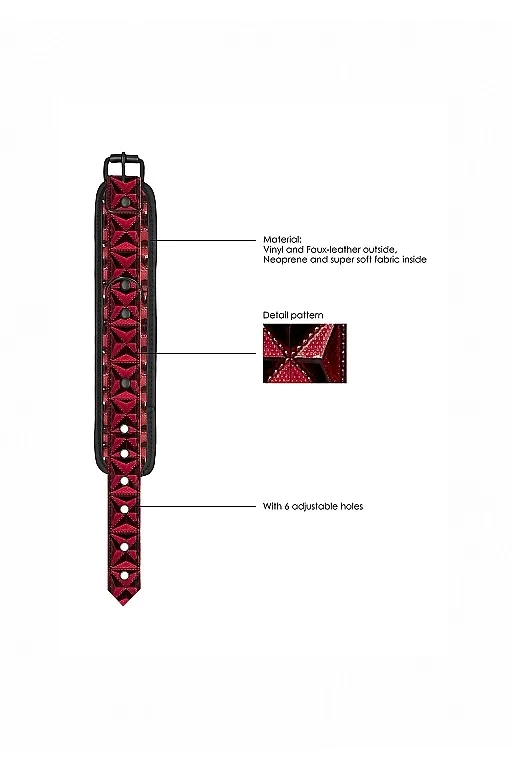 Аксессуар состоит из двух сверхпрочных и стильных широких полос из блестящего винила с ромбовидным рисунком, соединенных между собой снимающейся зачерненной цепочкой с карабинами по обоим бокам. Для максимального комфорта во время использования наручники имеют мягкую вставку из неопрена, закрывающую швы и стыки и защищающую запястья. Сочетание бургундского красного с черным делают оковы более эффектными и роскошными. Фиксация осуществляется с помощью ремешка с классической пряжкой. Имеется 6 отверстий, за счет чего можно идеально подобрать требуемый размер с идеальным плотным обхватом.