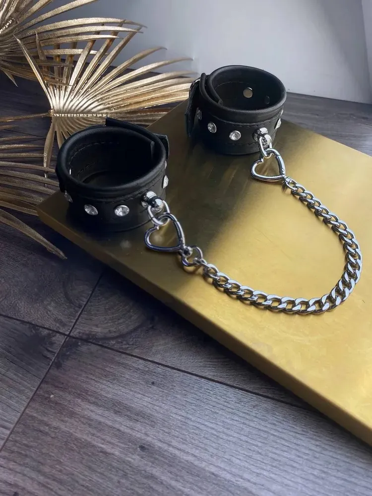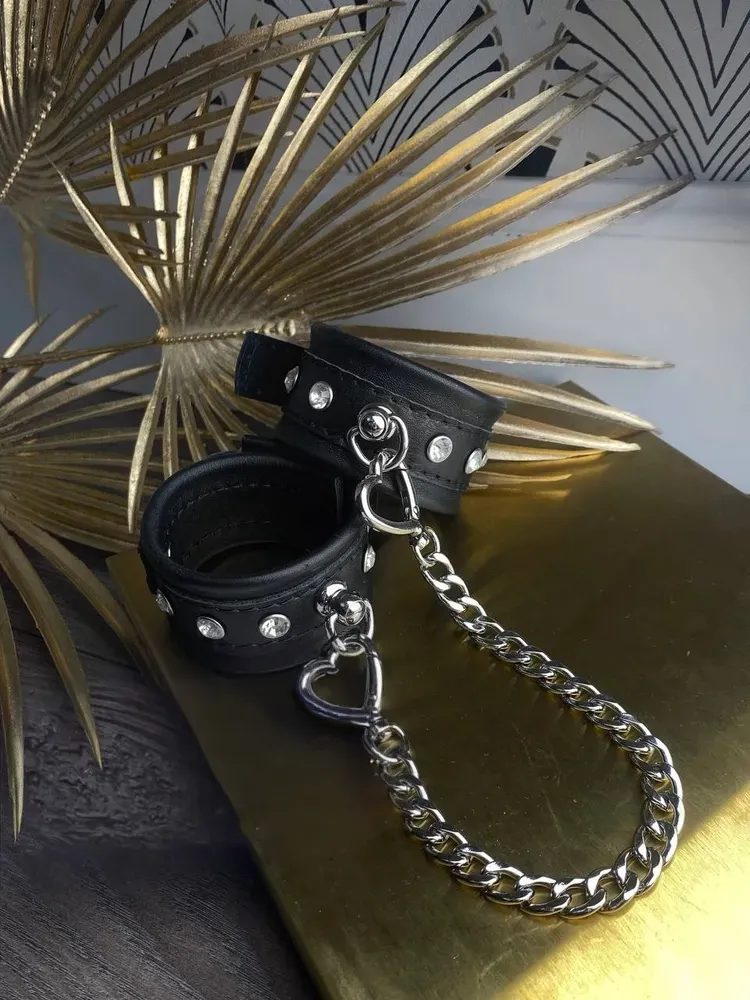 Теперь Вы можете быть уверены, что Ваш пленник не сбежит от Вас, если Вы обездвижите его с помощью этого БДСМ-аксессуара. Черные наручники декорированы металлическими клепками и соединены между собой при помощи цепочки. Ремешки с пряжками позволяют отрегулировать диаметр оков. Привнесите в Ваши интимные отношения немного разнообразия с помощью этого приспособления для сексуальных утех.
