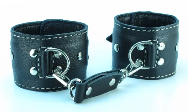 Оживить эротические игры Вам помогут наручники. Этот интимный аксессуар пользуется успехом у мужчин. Выполненные в черном цвете с белой отстрочкой и украшены прочными ремешками. Модный интимный аксессуар не сдавливает и не нарушает кровообращение, так как изготовлен из мягкой кожи. Чтобы любимая никуда не убежала, наручники соединены короткой перемычкой. Ширина оков - 5,7 см, длина перемычки – 6 см, производитель – BDSM Арсенал (Россия).