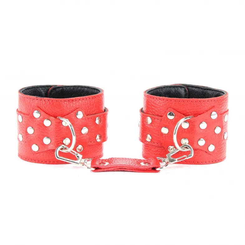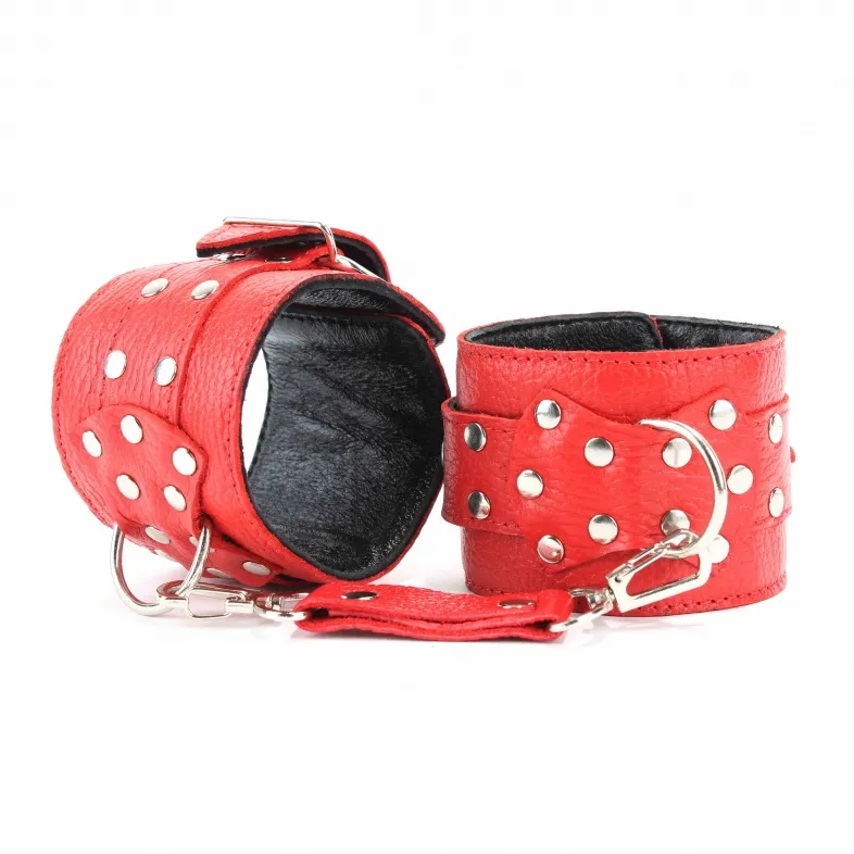 Оживить эротические игры Вам помогут наручники. Этот интимный аксессуар пользуется успехом у мужчин. Выполненные в красном наручники с пряжкой украшены прочными ремешками. Модный интимный аксессуар не сдавливает и не нарушает кровообращение, так как изготовлен из мягкой кожи. Чтобы любимая никуда не убежала, наручники соединены короткой цепочкой. Ширина оков - 6 см, длина цепочки – 12 см, производитель – BDSM Арсенал (Россия).