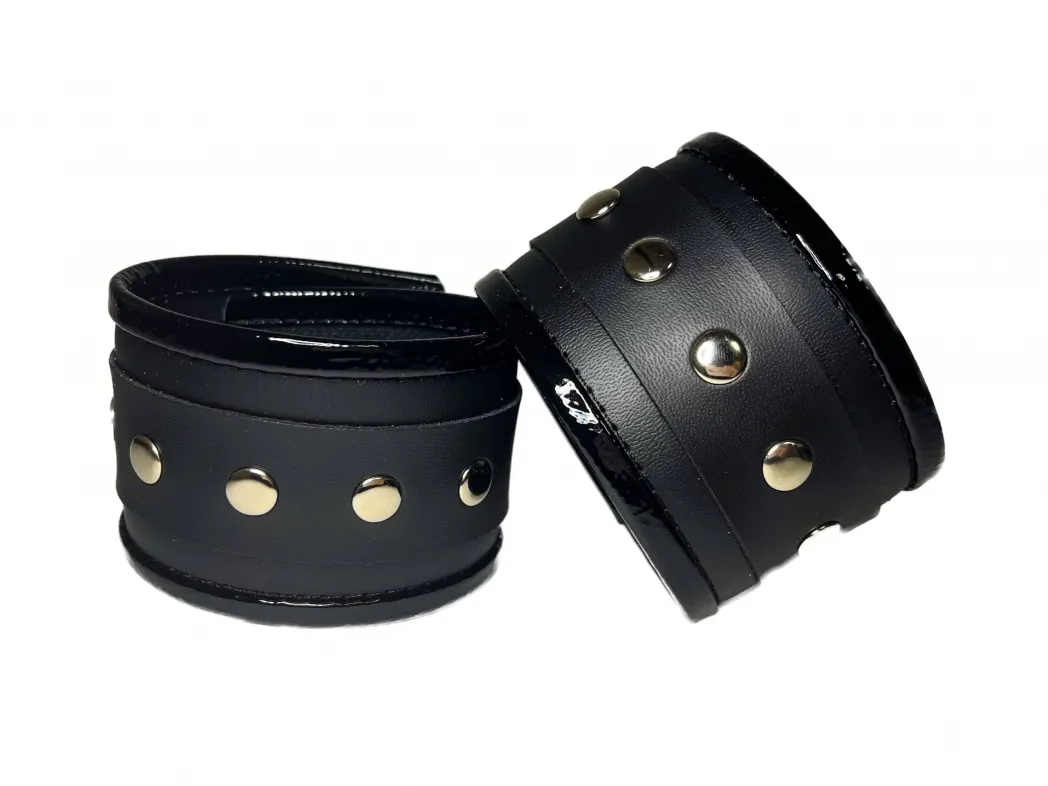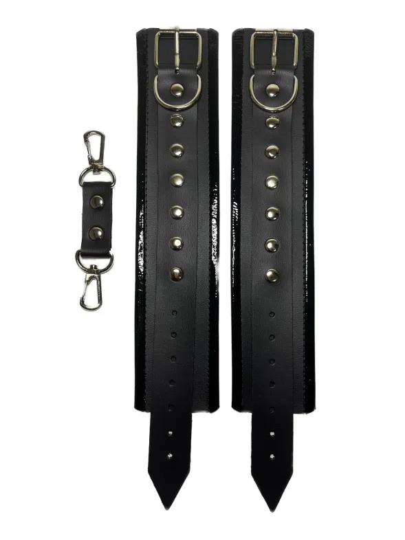 Красивые и функциональные наручники черного цвета, выполненные из искусственной кожи. Декорированы металлической фурнитурой и лаковыми вставками по краям. Обхват удобно регулируется с помощью пряжек. Ширина наручников 5,5см, общая длина наручника вместе с ремешком 31см. В комплекте идет соединение с карабинами, общая длина соединения 11см. Очень экономичный, экологичный и практически незаменимый аксессуар для вашей любовной игры! Материал: эко-кожа, металл Цвет: черный