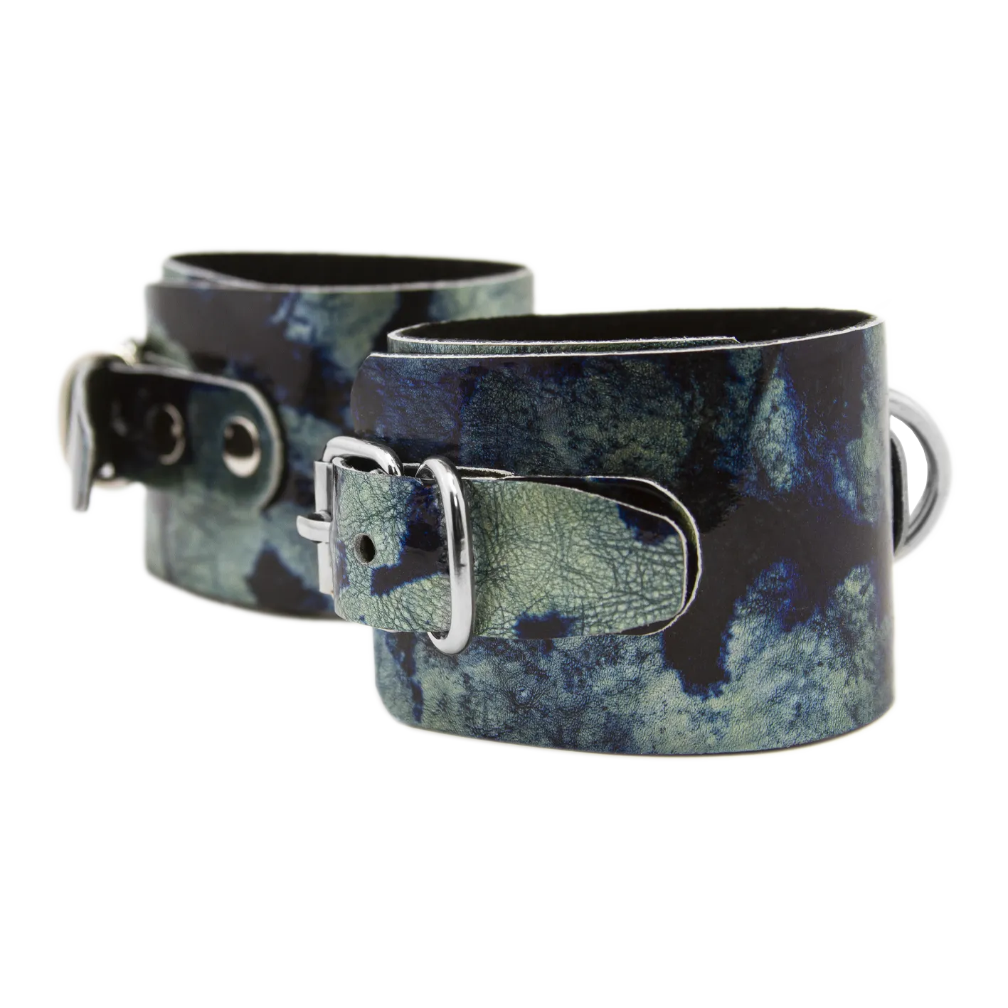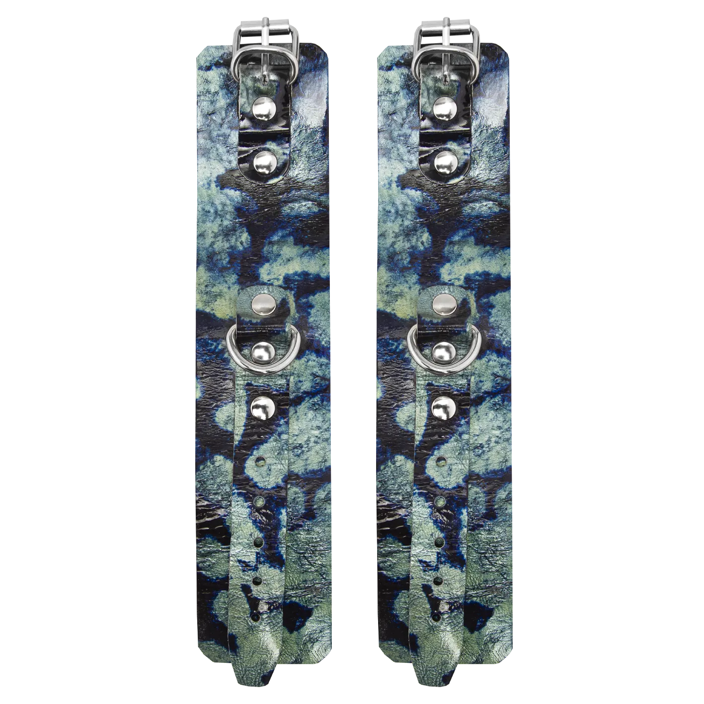 Наручники выполнены из натуральной кожи и декорированы металлическими клепками. Также у них есть D-образные кольца, к которым можно будет присоединять другие бондажные аксессуары. Наручи не нарушают кровообращение, просты в применении и обеспечивают надежную фиксацию. Их размер регулируется при помощи ремешков с пряжками.