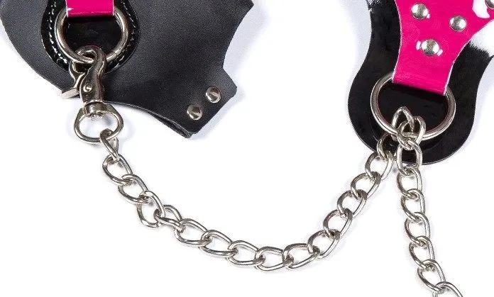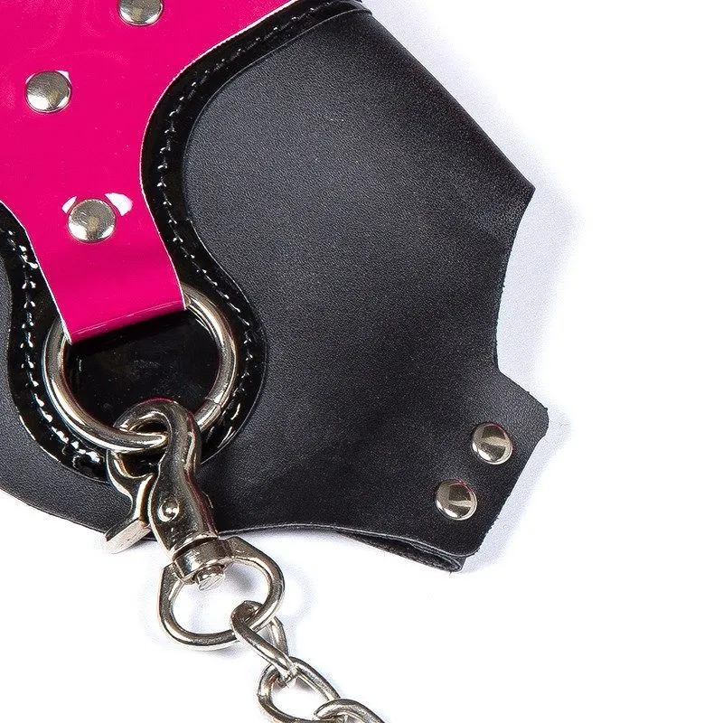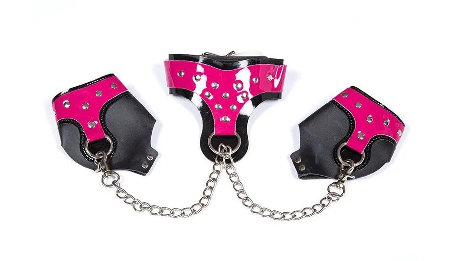 Комплект выполнен в нежном розовом цвете из полиуретана. Диаметр ошейника и наручников регулируется, цепочка отсоединяется.