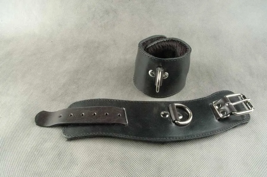Наручники сделаны из натуральной кожи черного цвета и подшиты мутоном, который предотвратит натирание кожи. Без соединительной фиксации. Регулируются по размеру ремешком с пряжкой. Обхват запястья от 14 до 22 см.