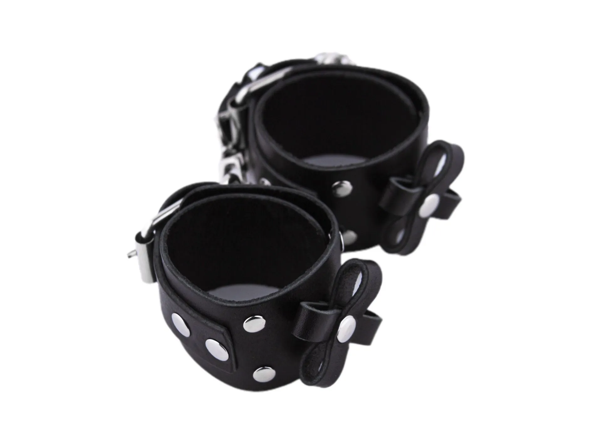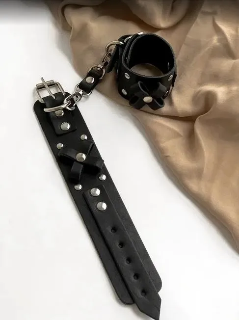 Наручники сделаны из натуральной кожи черного цвета и соединены между собой при помощи кожаной стяжки с карабинами. Они декорированы бантами, придающим им более нежный вид. Такой аксессуар позволит Вам обездвижить руки своего партнера, лишив его возможности сопротивляться и препятствовать Вашим ласкам. Невозможность двигать руками обострит все чувства партнера, делая его особенно чувствительным ко всем прикосновениям. Наручники разнообразят Ваши интимные игры и позволят испытать новые ощущения во время секса.