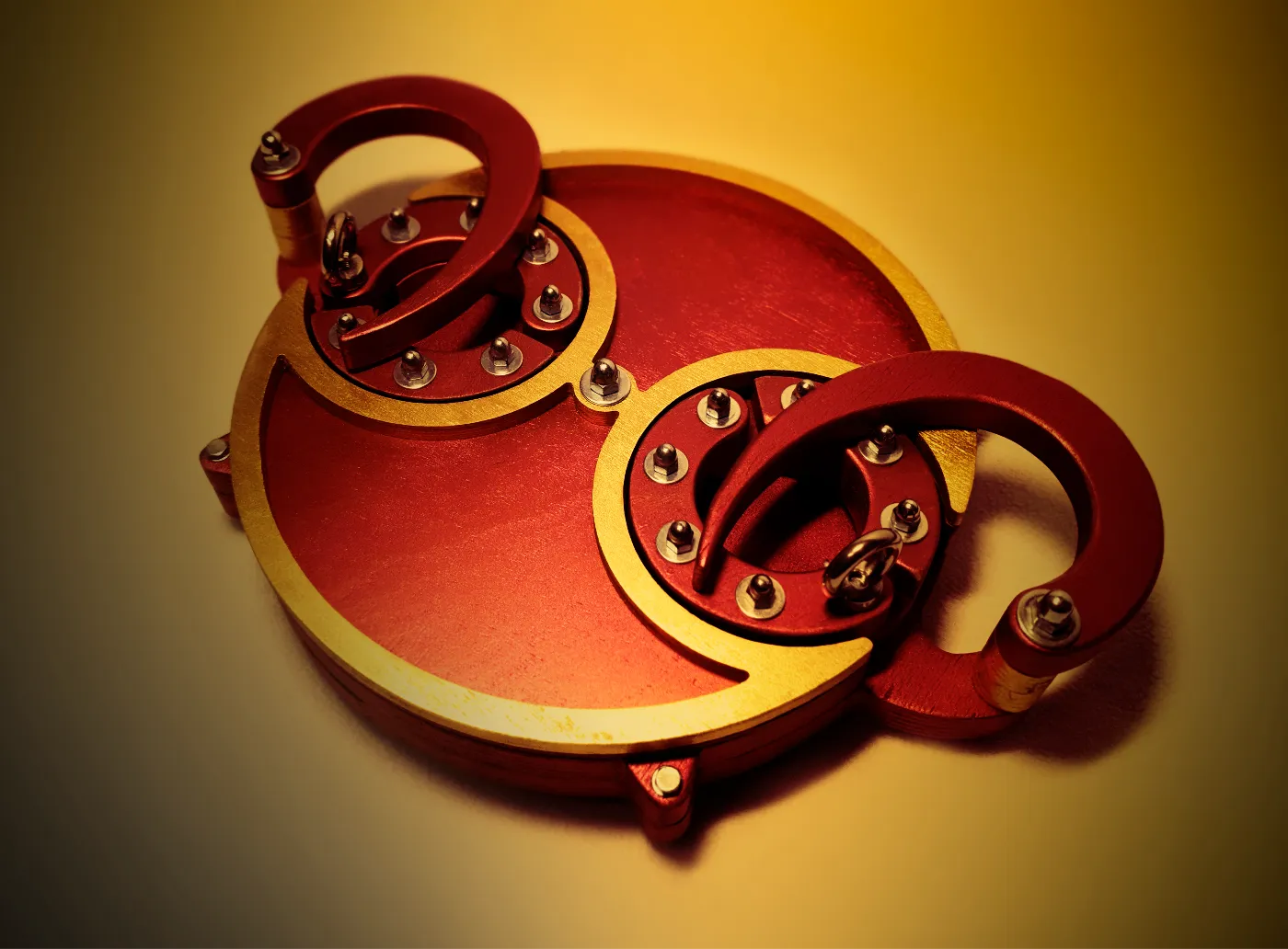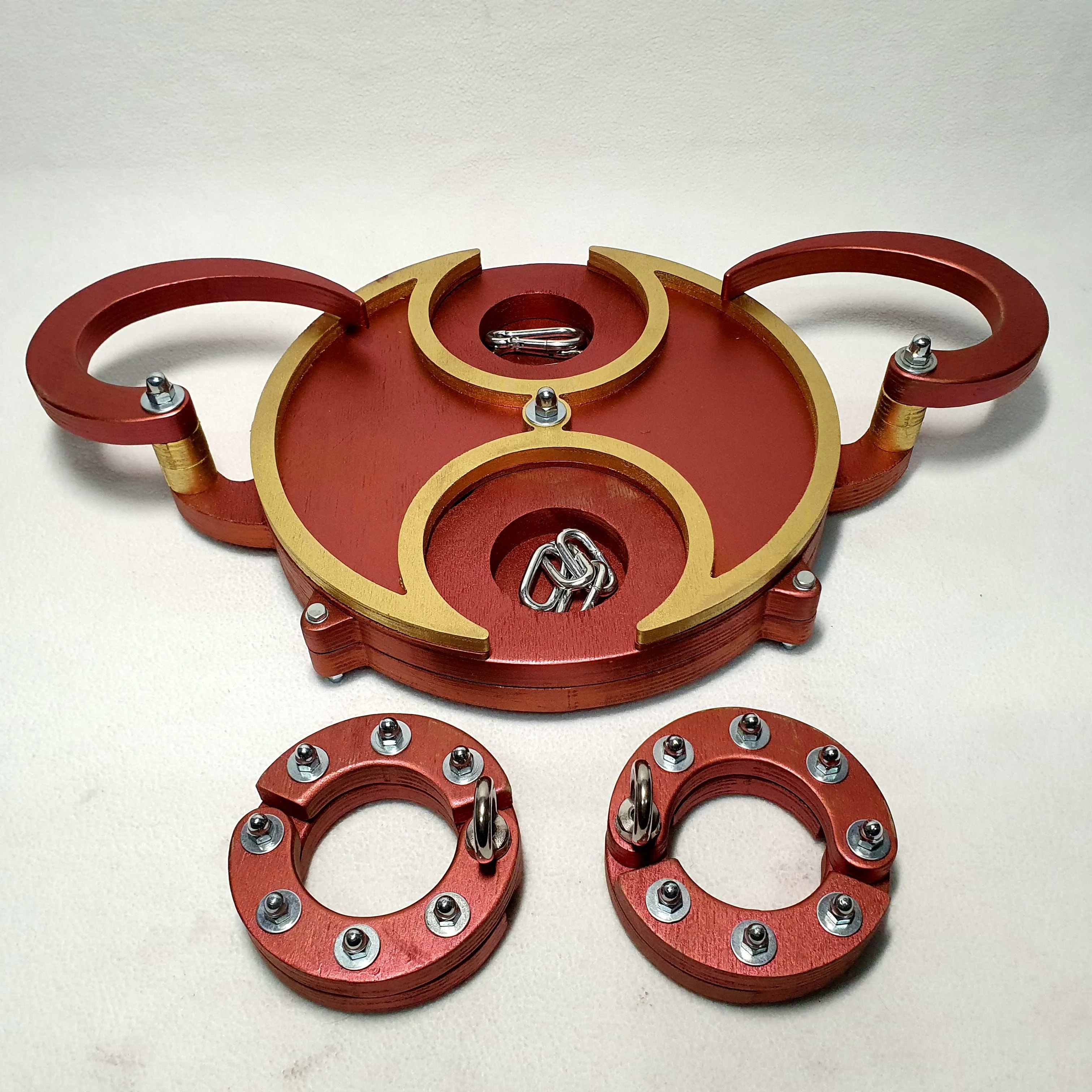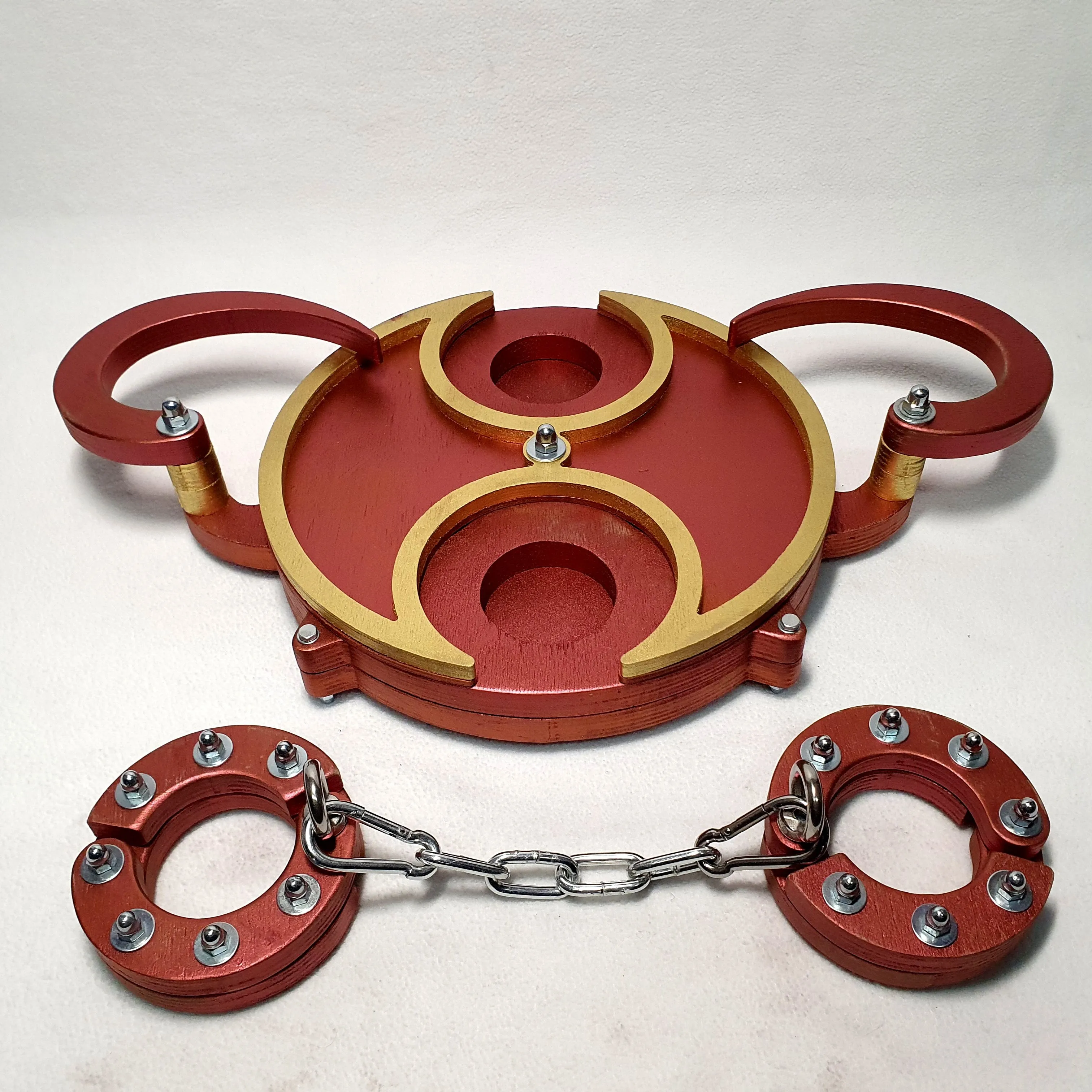Браслеты могут быть использованы как украшения или как наручники для секса. В комплекте есть жесткие цепи с карабинами. Окантовку шкатулки и браслетов можно покрыть люминесцентной краской, тогда они будут светиться в темноте.
