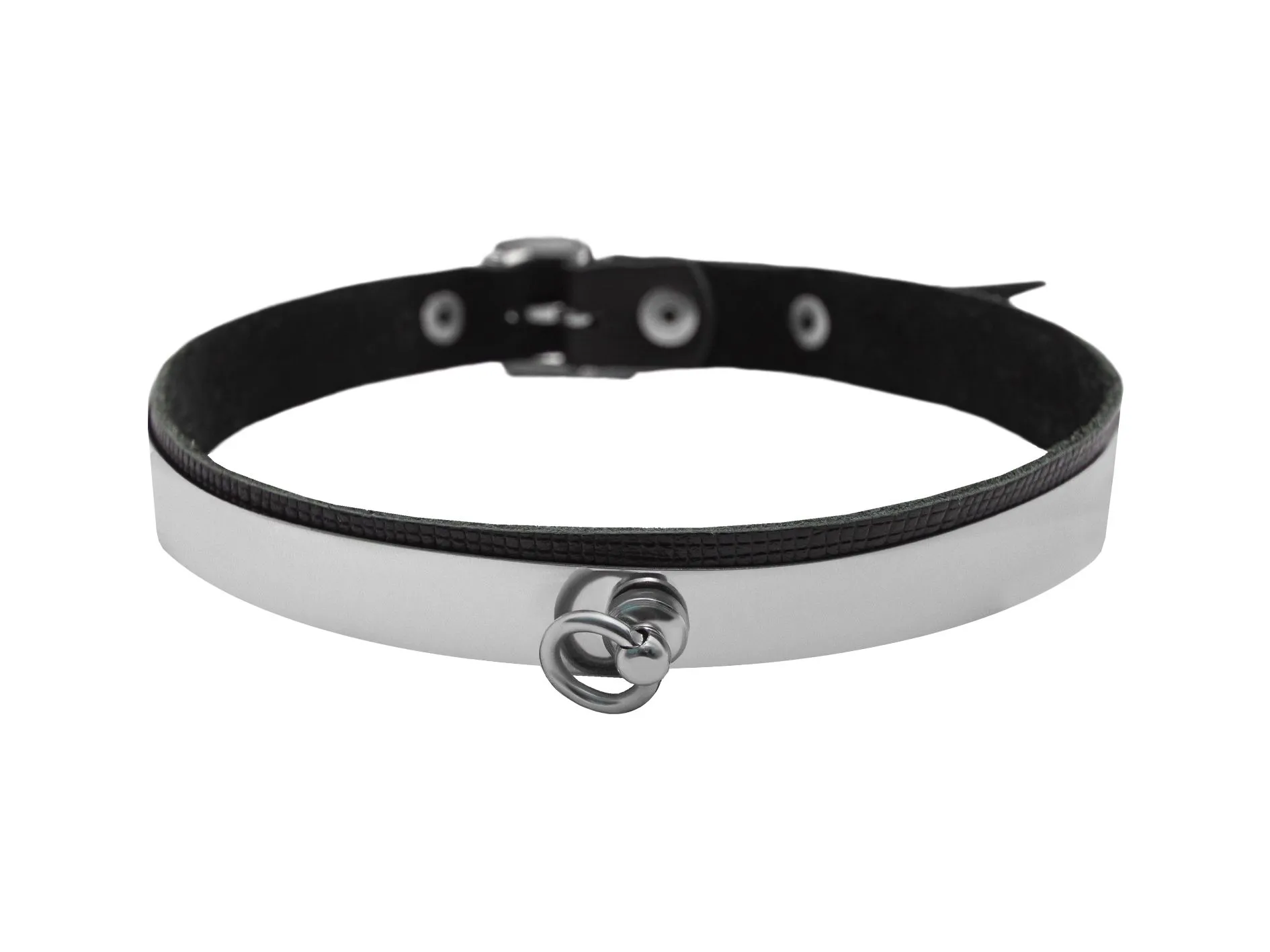 В БСДМ практике ошейники используются в качестве не только красивого аксессуара, но и для подчинения «нижнего». Этот девайс обостряет ощущения и позволяет открыть новые грани чувствительности. Узкий ошейник выполнен из металла, декорирован металлическими заклепками и маленьким кольцом. Мягкая подкладка делает ошейник удобным и комфортным для ежедневной носки.