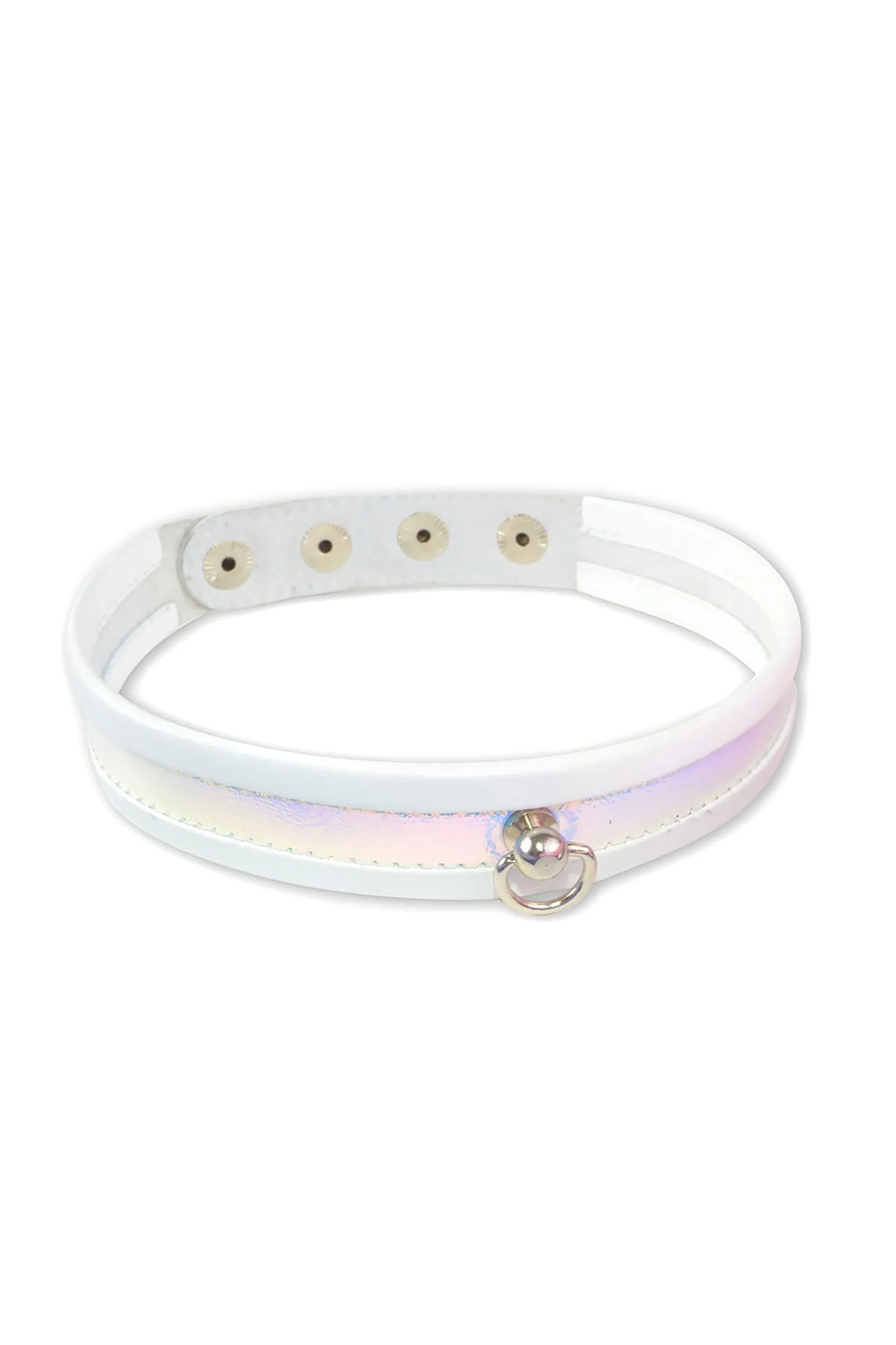 Белоснежный сверкающий узкий ошейник от Sitabella подойдёт, как для «ванильных» ролевых развлечений, так и для сессий BDSM. Узкий, аккуратный он плотно и комфортно прильнёт к Вашей шее. Скруглённые края ошейника придают ему рельефность, объёмность, а самое главное, не позволяют врезаться в нежную кожу шеи. Особенность данного ошейника в том, что он декорирован голографической вставкой, которая переливается нежными тонами: розовым, голубым, серебристым, сиреневым. Помимо собственных оттенков ошейник отражает окружающие цвета, что делает его колорит ещё богаче. Ошейник изготовлен из натуральной белой кожи и имеет кнопки с никелевым покрытием, для регулировки размера изделия на теле. В центре передней части ошейника имеется небольшое полукольцо для поводка. Ширина ошейника 2 см. Длина 41 см.