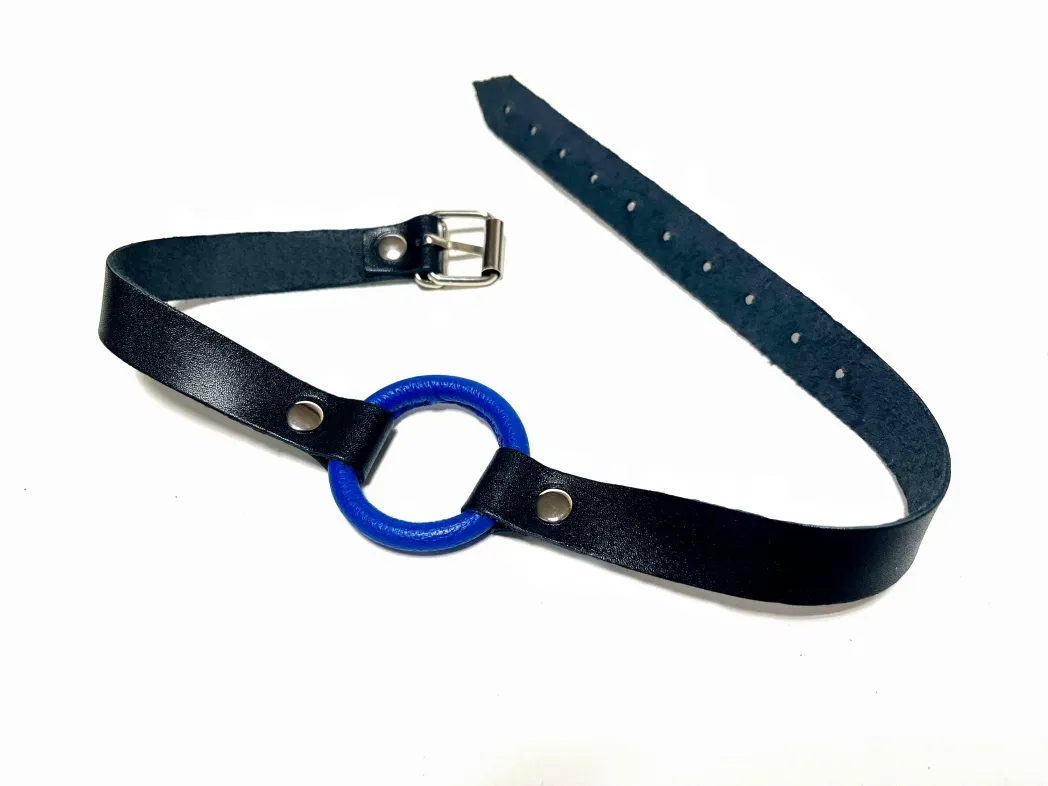 Строгий и надежный кляп, выполненный из натуральной кожи черного цвета. В основании использовано сварное металлическое кольцо диаметром 4,5 см, обтянутое нежной овечьей кожей синего цветж. Ширина ремешков 1,8см, обхват удобно регулируется с помощью металлической пряжки. Такой кляп станет отличным элементом БДСМ игры, функциональным и комфортным в использовании. Материал: натуральная кожа, металл Цвет: черный, синий