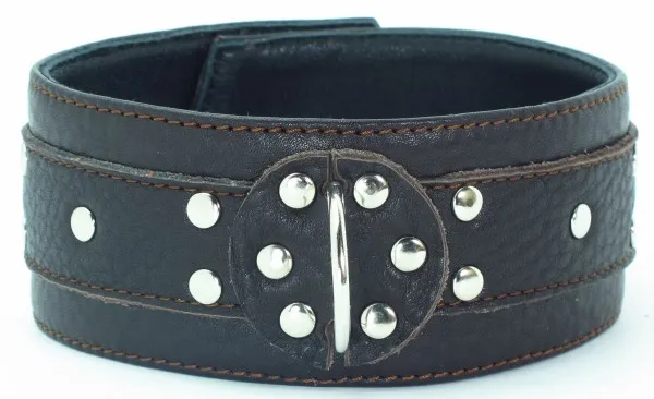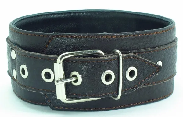 Ошейник выполнен из качественной натуральной коричневой кожи, мягкий и комфортный в использовании. Впереди находится сварное полукольцо. Ширина ошейника 5см, ширина ремешков 3см.Аксессуар декорирован металлическими заклепками, фиксируется ремнем сзади, удобно регулируется длина, подойдет на обхват от 30 до 38см.Стильный аксессуар поможет воплотить эротические фантазии в реальность. Материал: натуральная кожа, металл Цвет: коричневый