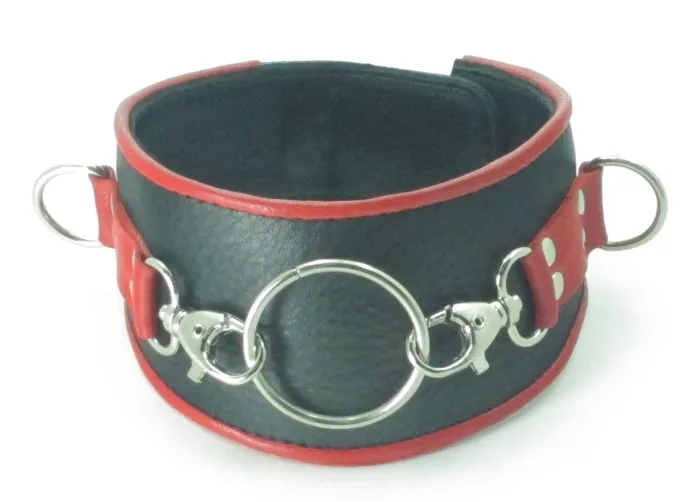 Оригинальный ошейник из мягкой кожи в стильном красно-черном исполнении. БДСМ-атрибут используют в откровенных властных играх. Стильный ошейник выполнен из качественной, мягкой кожи. Украшен модными заклепками и имеет несколько колец. БДСМ-атрибут регулируется при помощи застежки. Пополните свою коллекцию БДСМ достойным аксессуаром отличного качества. Макс. ширина - 6,5 см.