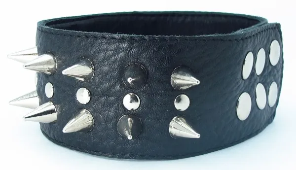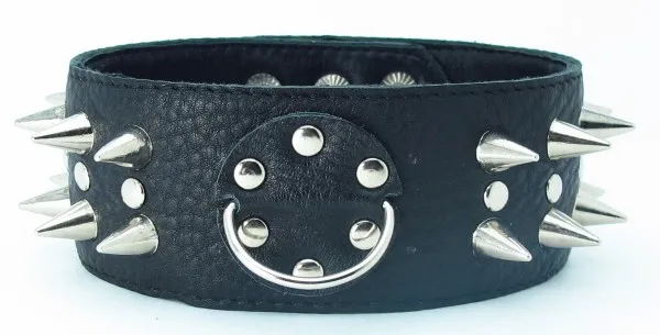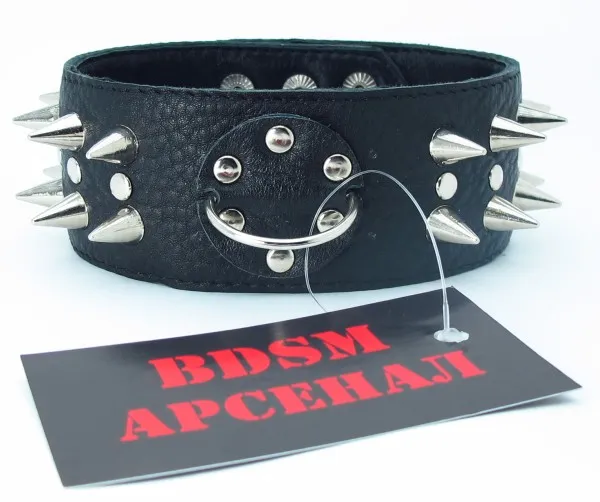Ошейник черного цвета, выполнен из высококачественной кожи. Ширина фетиш атрибута составляет 5 сантиметров, украшен двумя рядами шипов по всей длине изделия. Размер регулируется при помощи застежек-кнопок. Для крепления различных элементов бандажа, а также поводков и цепочек на БДСМ девайсе предусмотрено одно сварное D-видное кольцо. Общая длина ошейника - 42 см