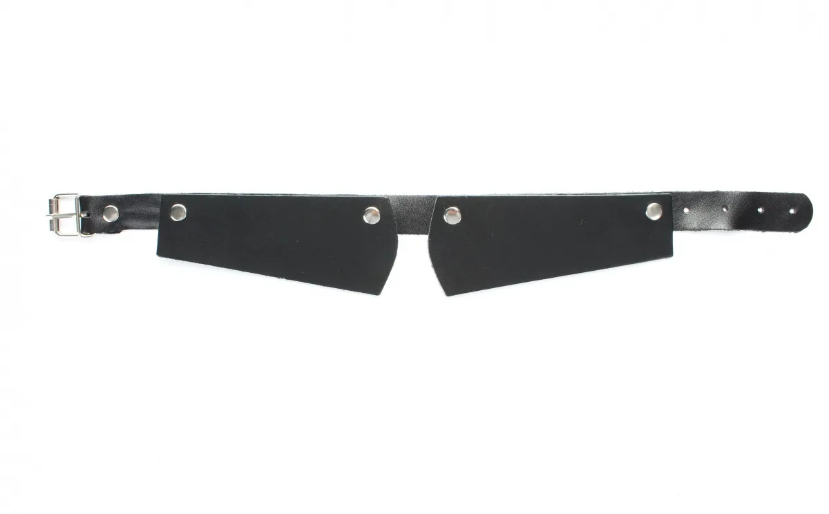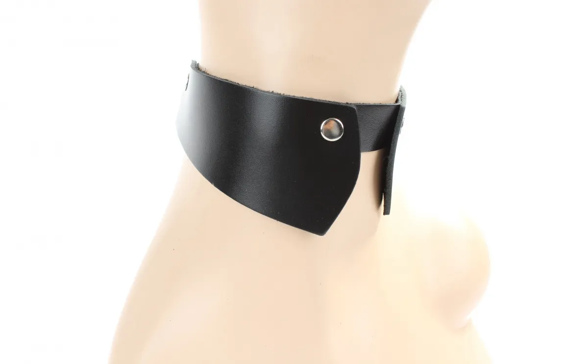 Чокер выполнен из натуральный черной гладкой кожи. Форма аксессуар напоминает воротничок, ширина в центре 5см, по краям 3см, ширина ремешка 2см.Декорировал заклепками впереди, регулируется пряжкой сзади, подойдет на обхват от 29 до 39см. Стильный чокер подчеркнет вашу индивидуальность. Материал: натуральная кожа, металл Цвет: черный