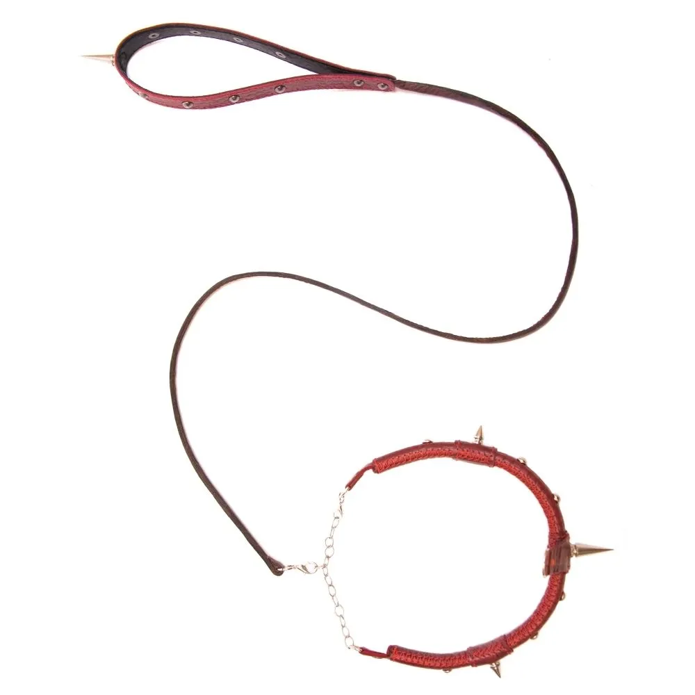 Поклонникам ролевых интимных игр придется по вкусу красный кожаный ошейник с поводком. Ремешок и поводок украшен металлическими шипами, благодаря которым они выглядят невероятно эффектно. Ошейник пристегивается к поводку за небольшой карабин. При помощи поводка Вы сможете взять под полный контроль своего партнера и направлять его движения или же одергивать в случае неповиновения. Изделие прекрасно подойдет для БДСМ-развлечений и позволит реализовать самые нескромные сексуальные фантазии.